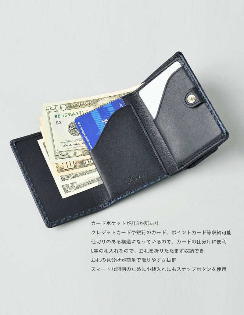 お札を折りたたまず収納出来るL字型の札入れ。
