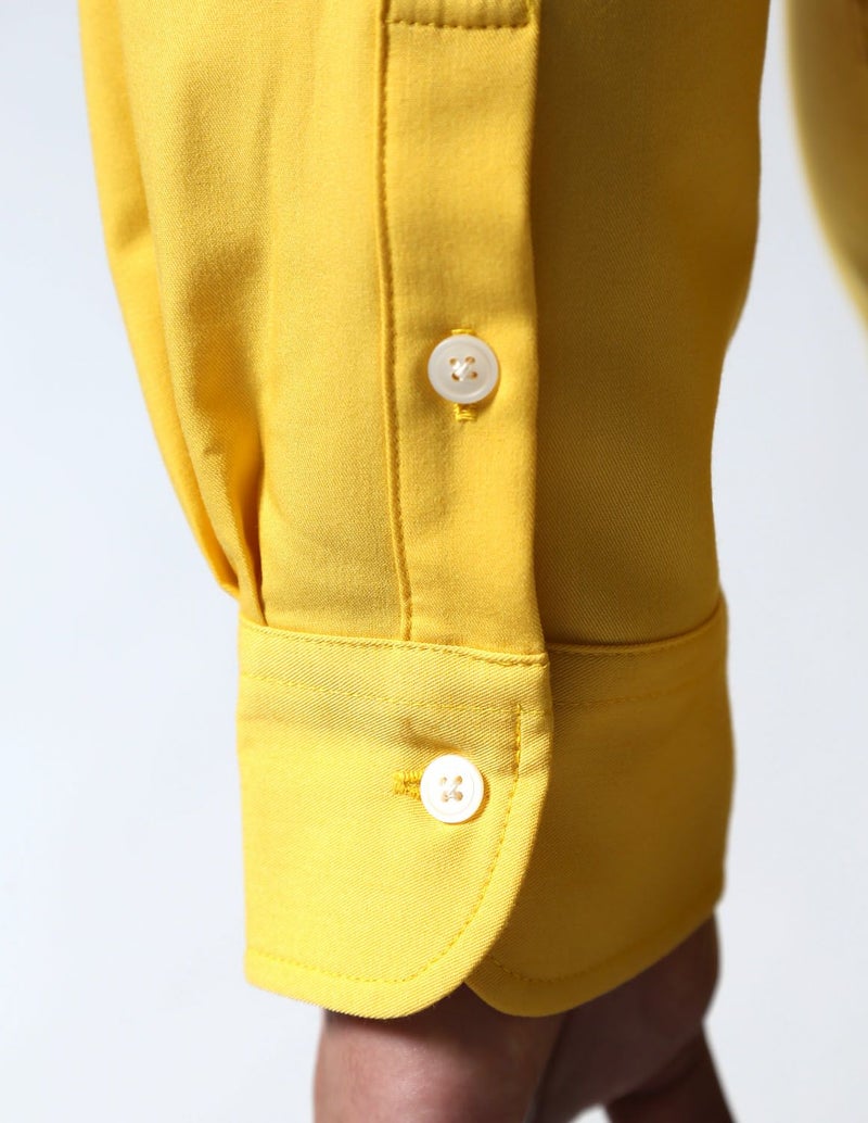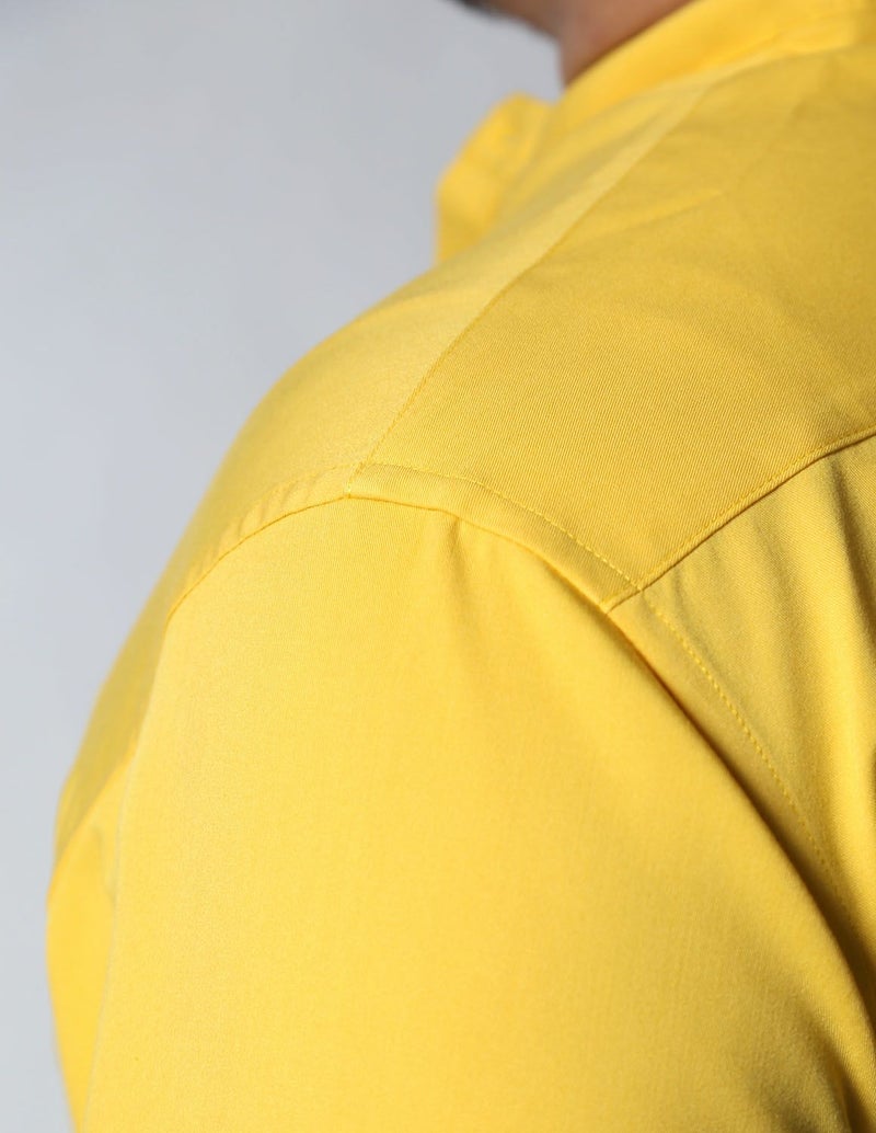 通常のシャツのような三角の襟ではなく、帯(バンド)のような形の襟で首元に丸みがあり柔らかい印象を演出してくれます。