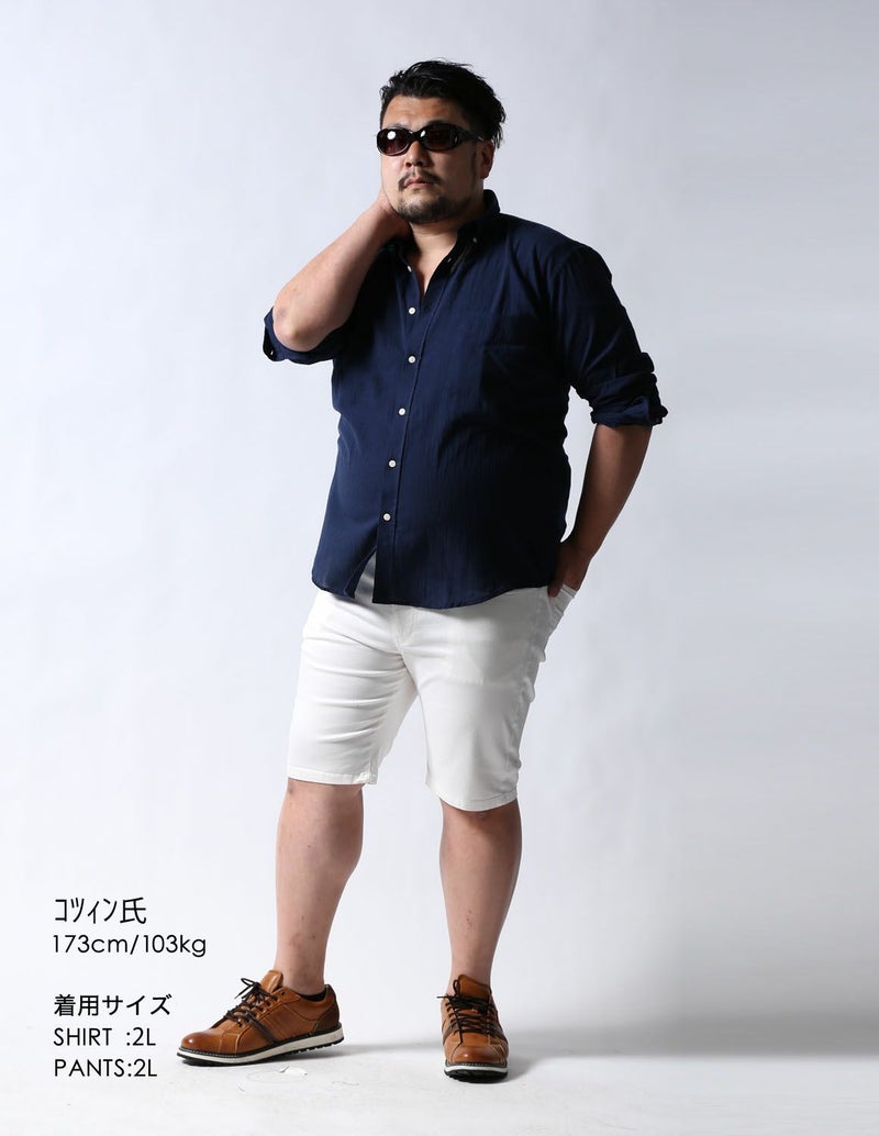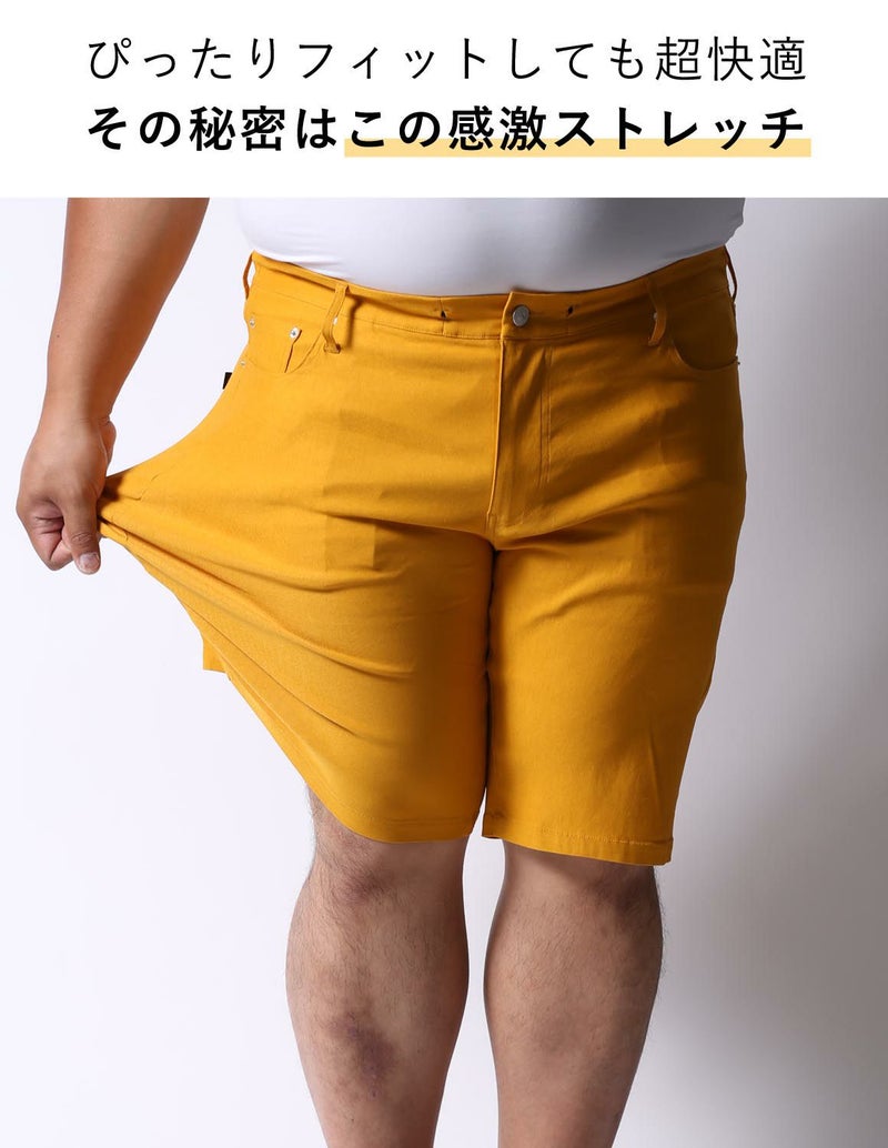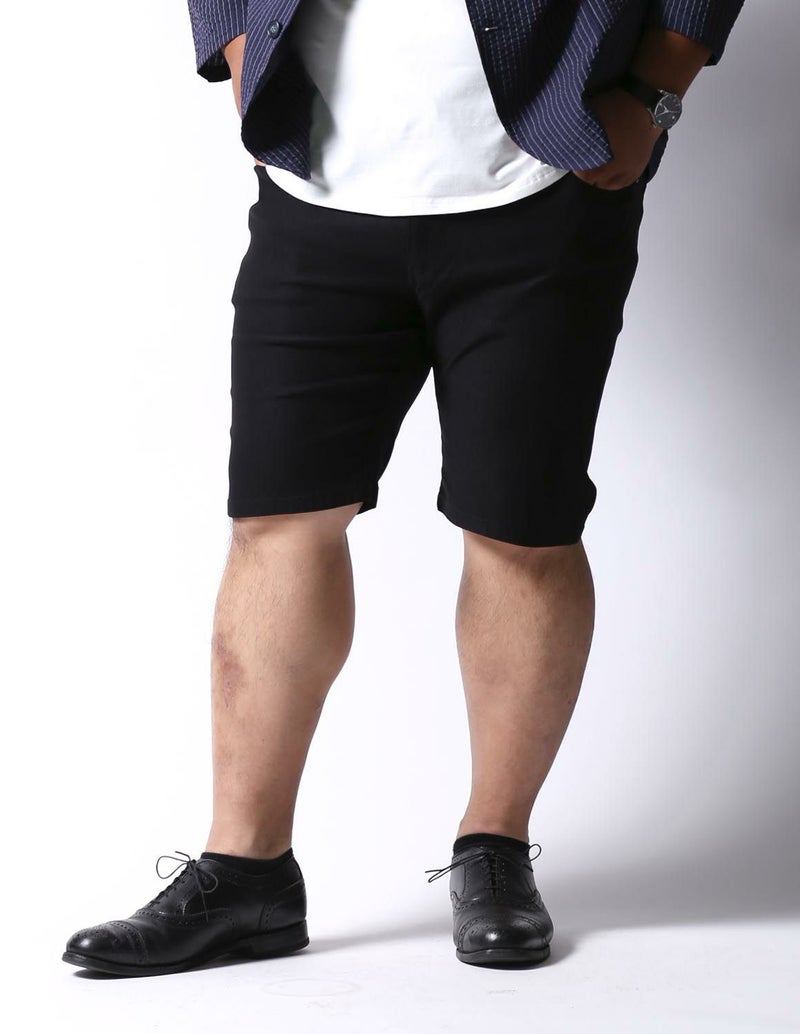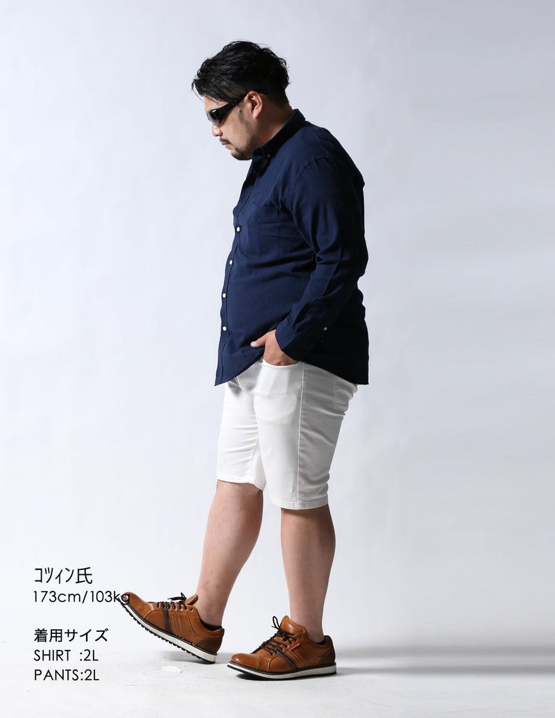 今までの大きいサイズのハーフパンツは裾口が広くてダボっとしていましたが、ストレッチが身体に程よくフィットし、ハーフパンツでもキレイなシルエットを実現しました。