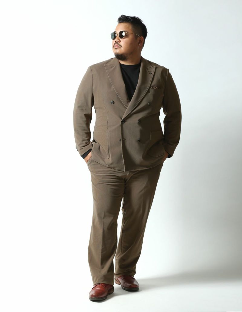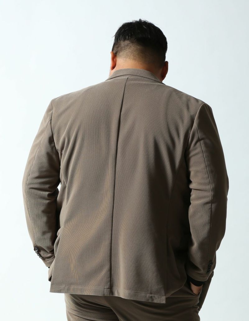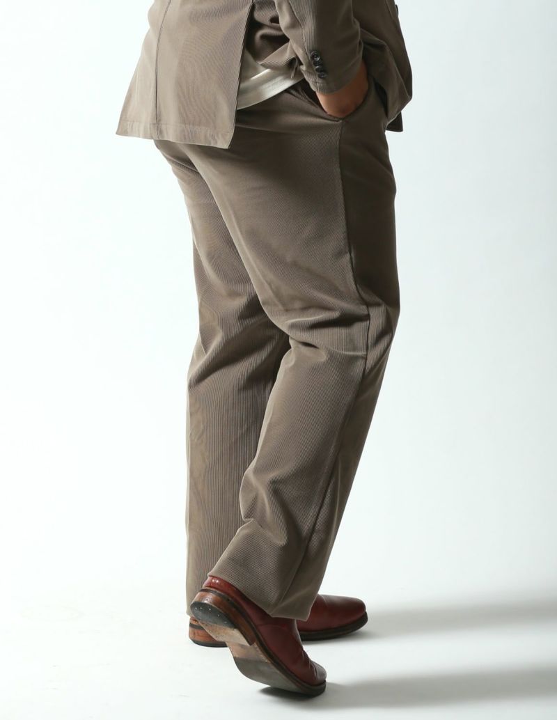 ニット生地でありながら、織物のようにしっかりした素材感が特徴の「トリコットニットコーデュロイ」を使用したセットアップが登場。