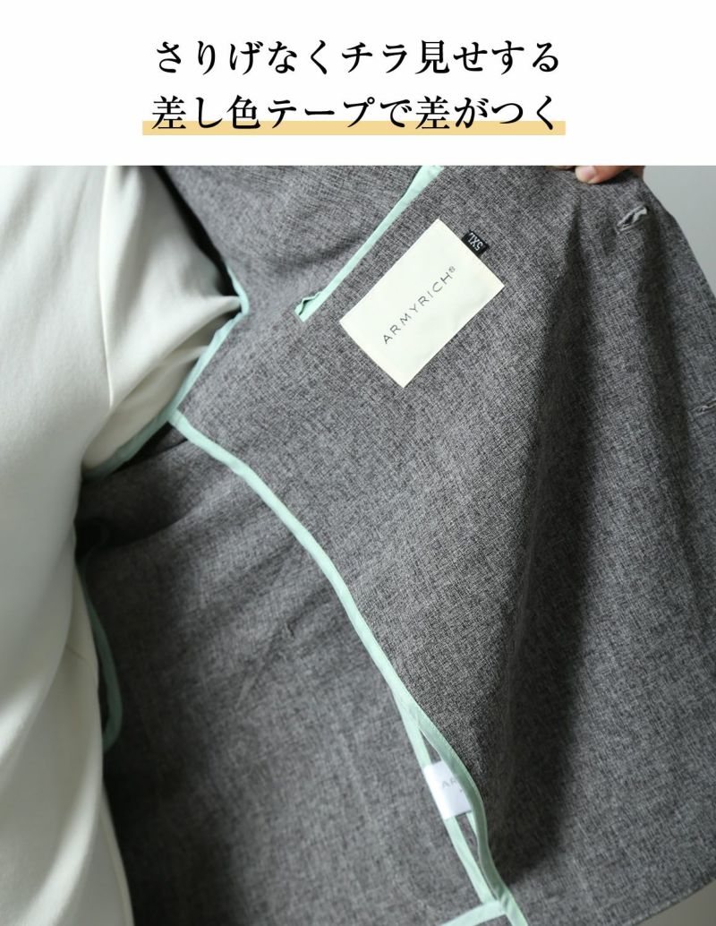 裏地に付いているバイアステープは差し色にグリーンを採用し、さりげなくチラ見せすると差がつく着こなしが可能です。