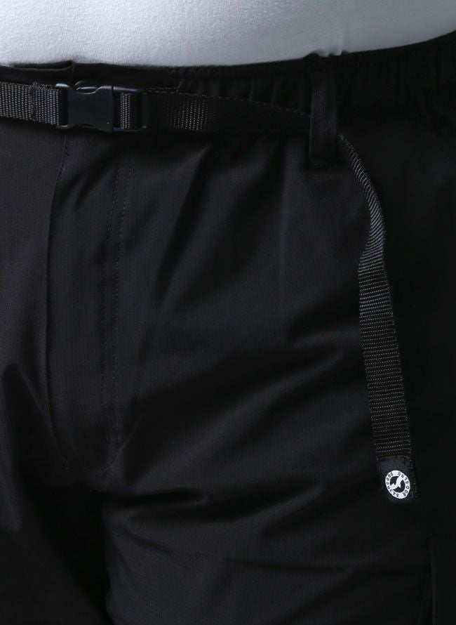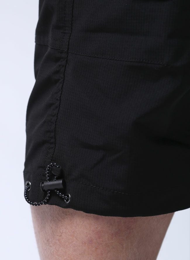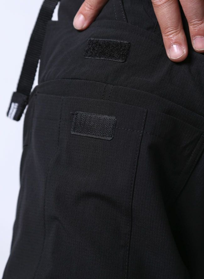 素材にはアウトドア用品によく使われるストレッチ入りのポリエステル生地を採用!格子状に織り込んだ引き裂け防止機能のあるリップストップ素材で、サラっとした薄手生地のスッキリシルエット