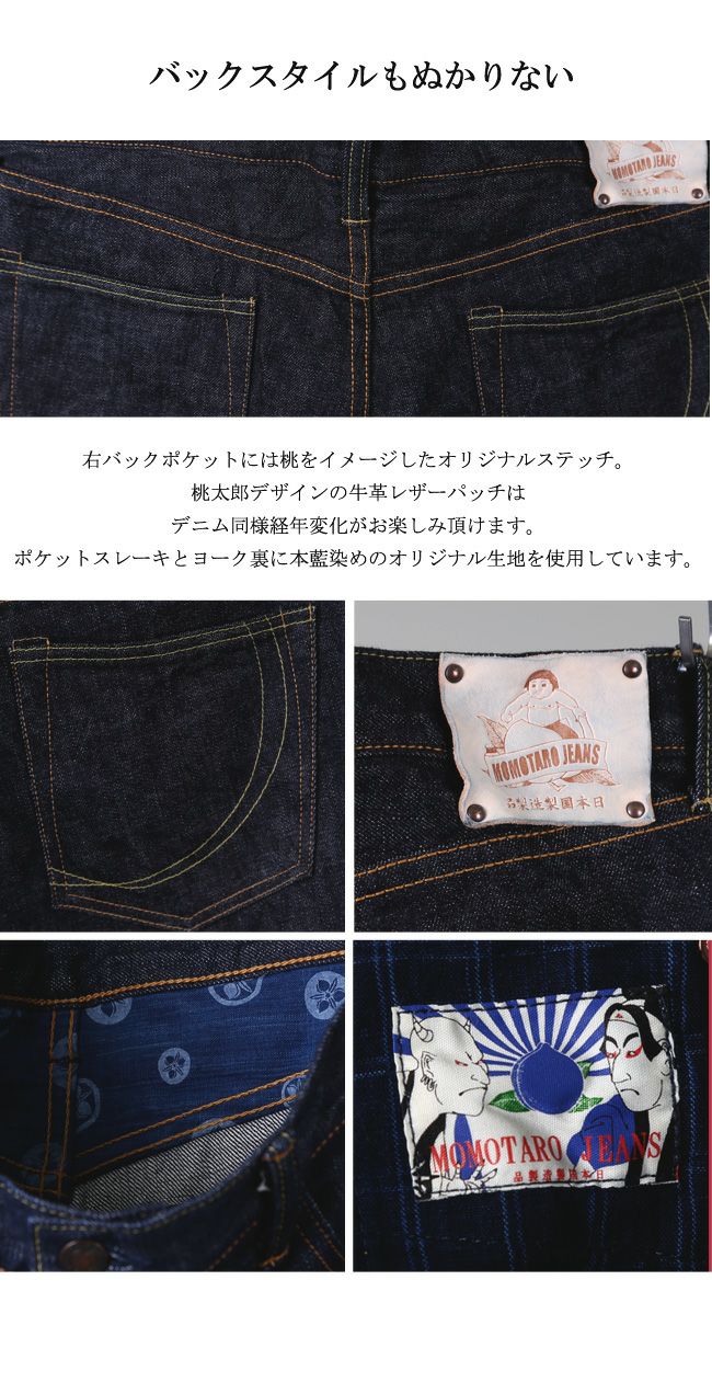 皆が大好きな桃をイメージしたステッチを右バックポケットに配し、ポケットスレーキやヨーク裏に本藍染めの生地を贅沢に使用しています。