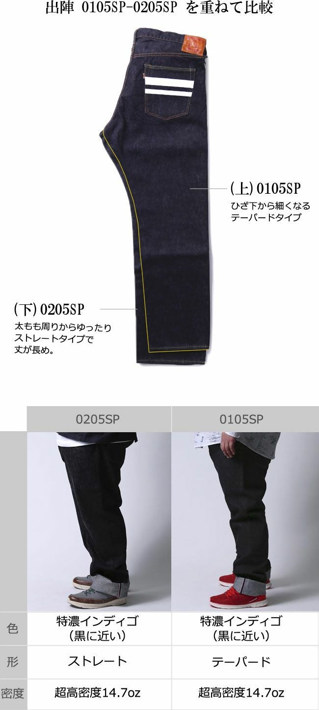 桃太郎ジーンズのレーベルの1つ「出陣」。その特徴的な2本のホワイトラインが目を引く、ストレートタイプのジーンズが登場。