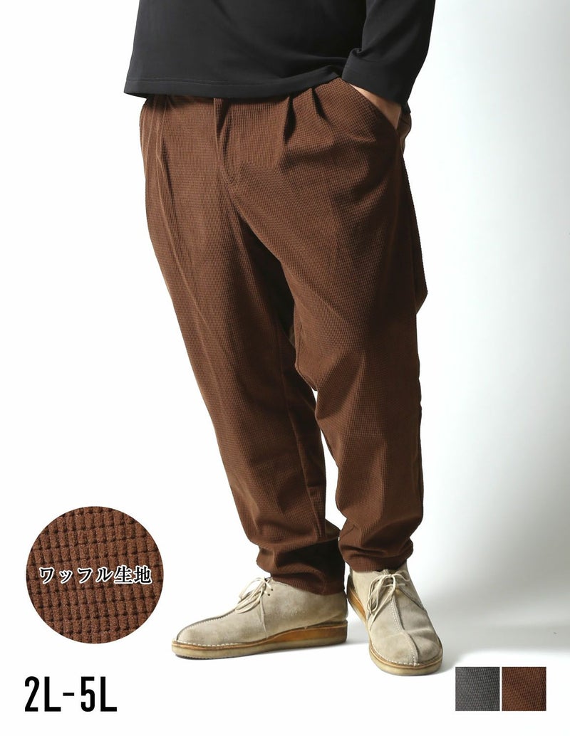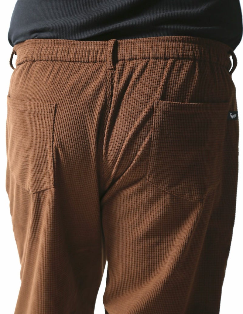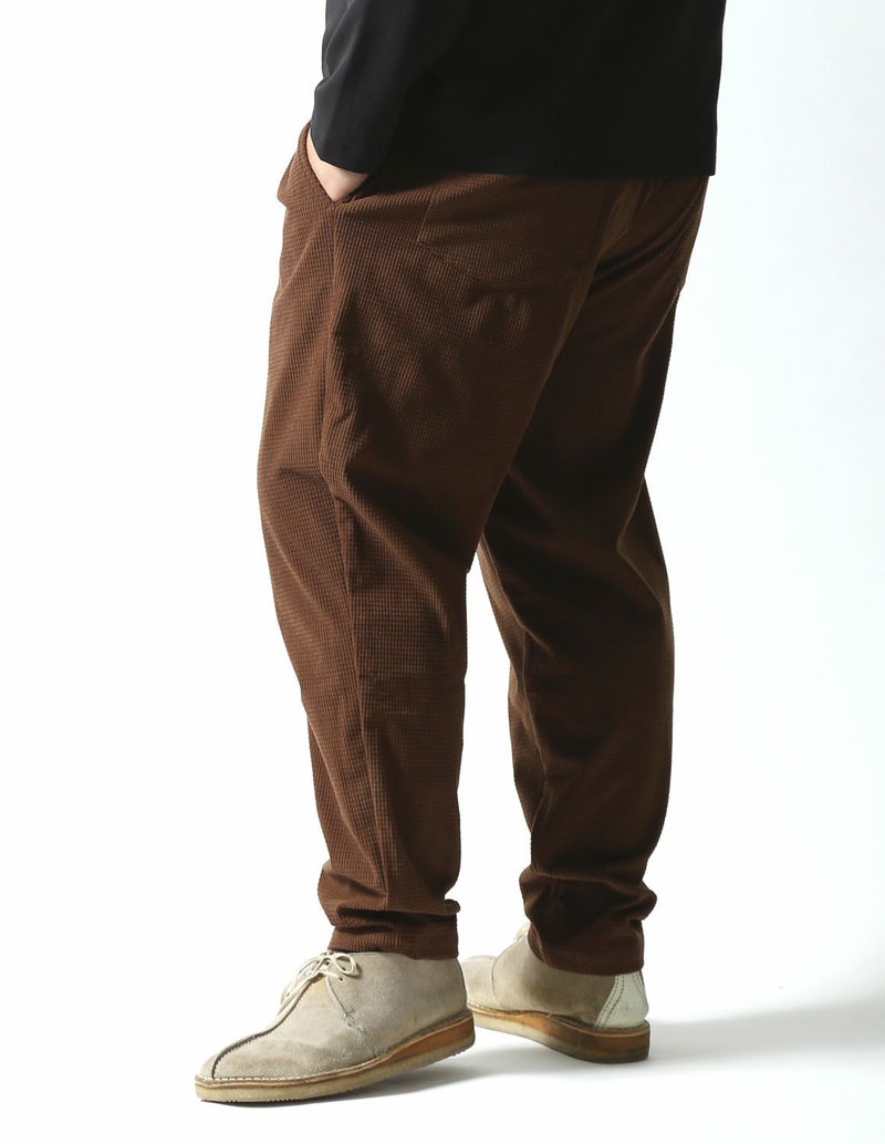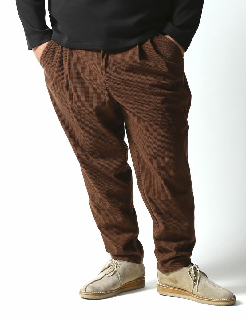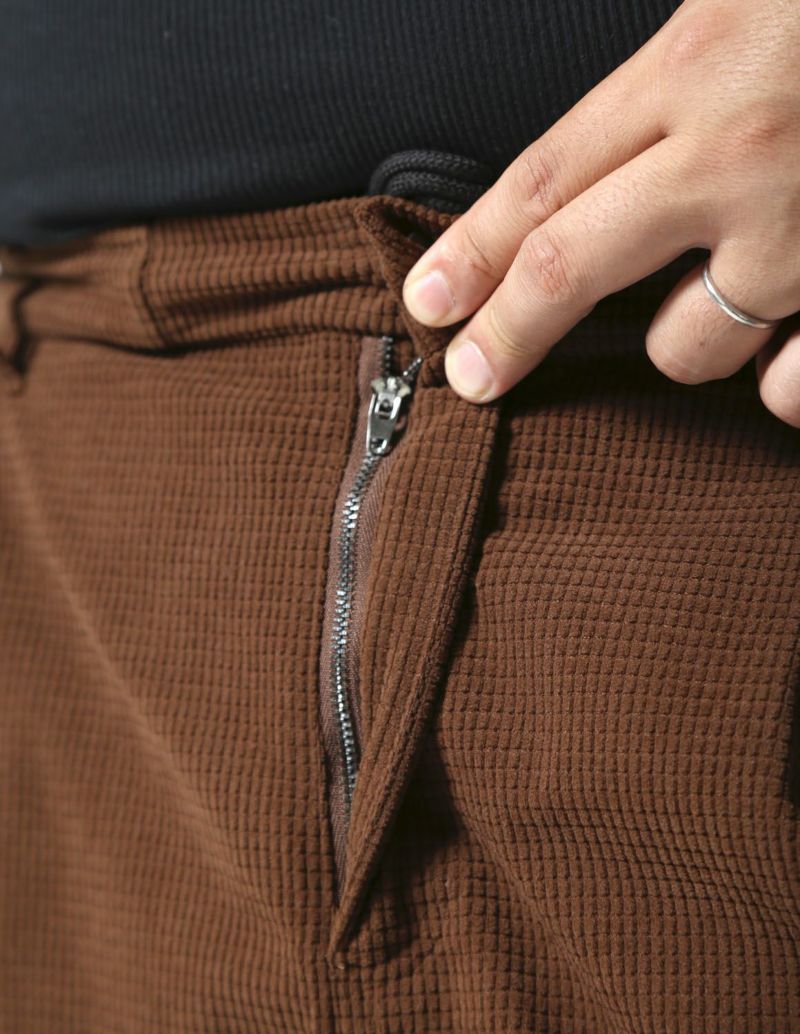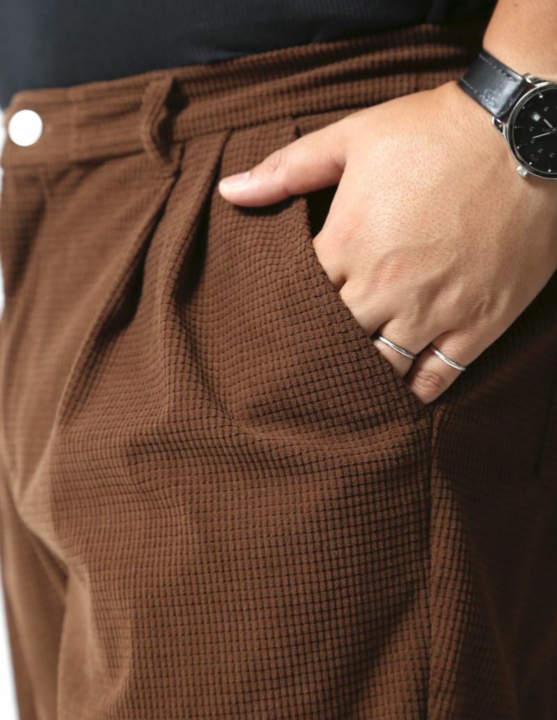 マットな光沢感で存在感あるワッフル状の編みをした生地で、凹凸感があり程良く個性のある生地感のボトムス。