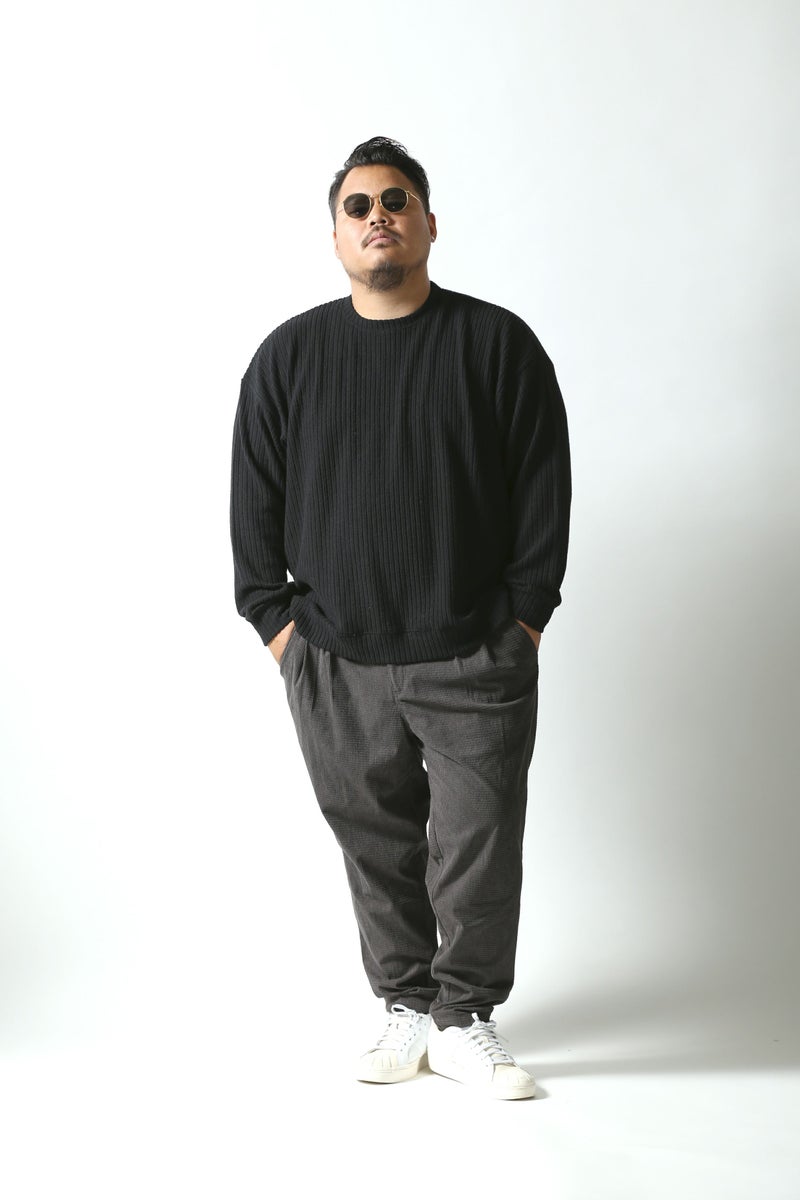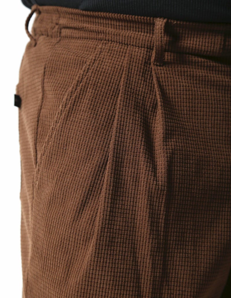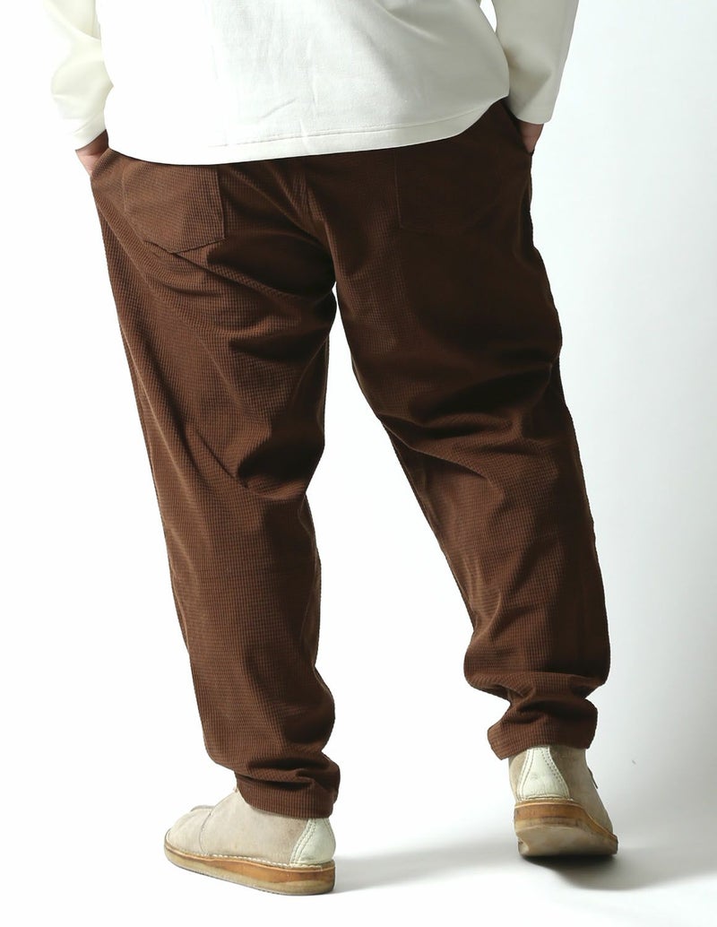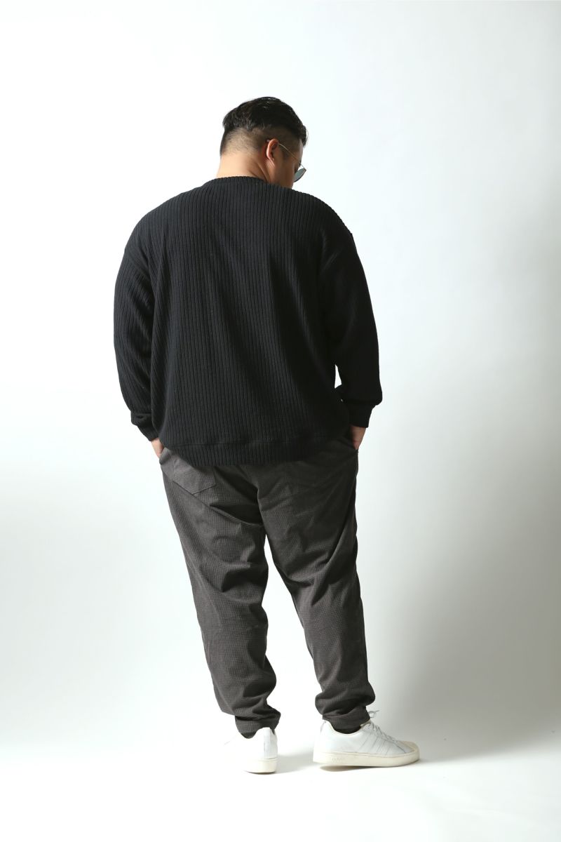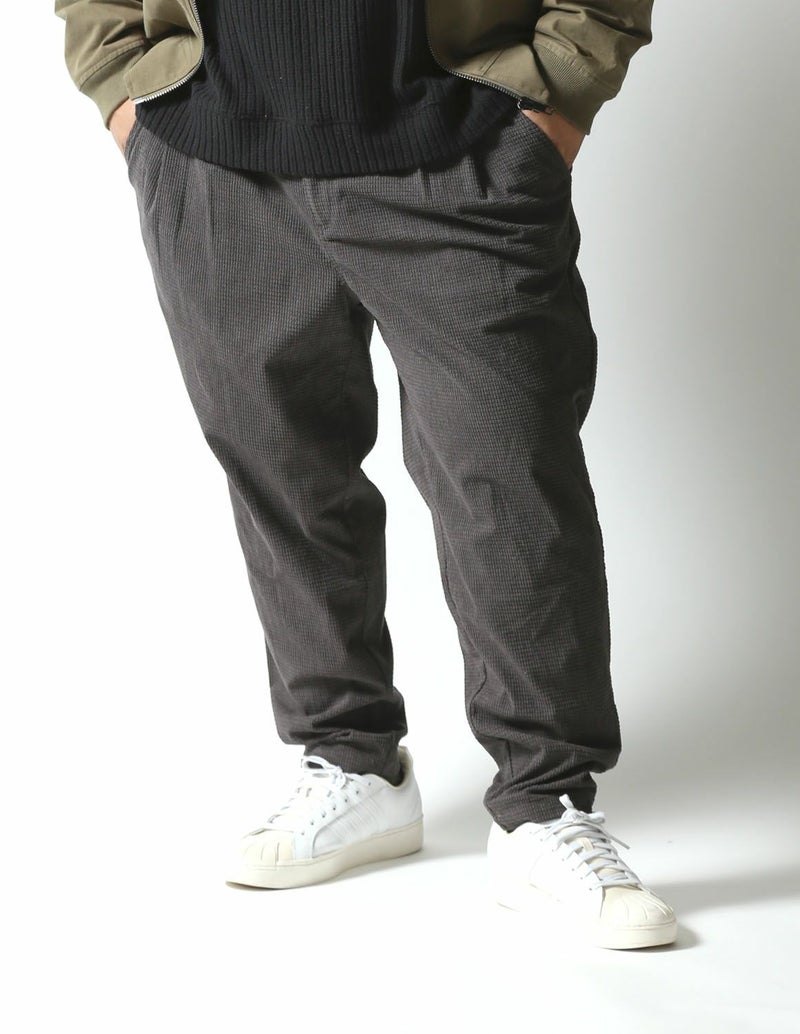 マットな光沢感で存在感あるワッフル状の編みをした生地で、凹凸感があり程良く個性のある生地感のボトムス。