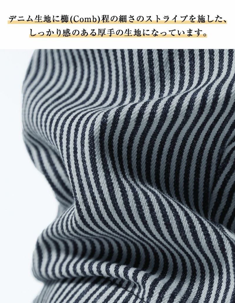 主張し過ぎないヒッコリーストライプ柄で大人のカジュアルセットアップなので、インナーにTシャツやシャツなどを着れば簡単にコーデが完成します。