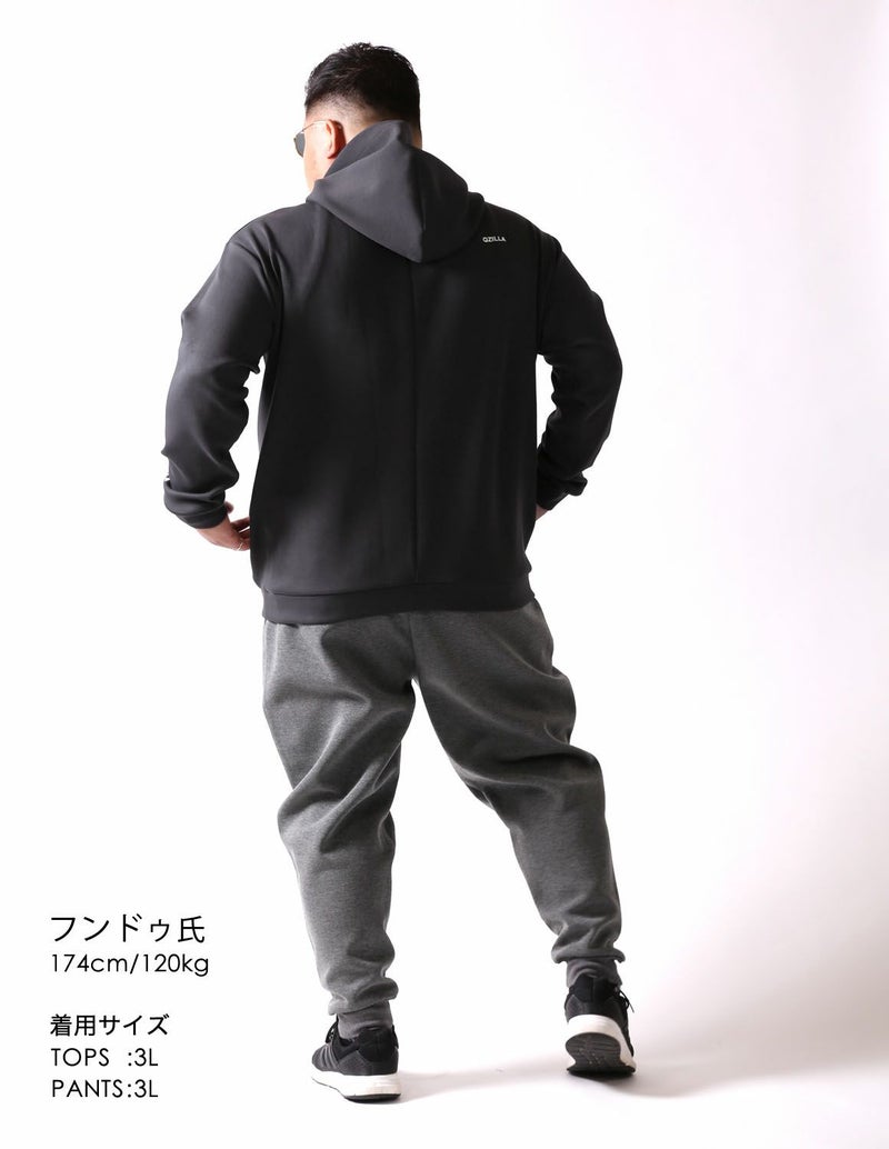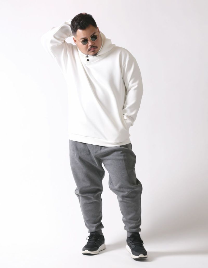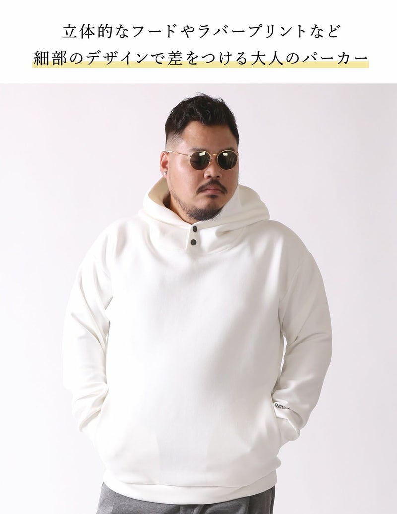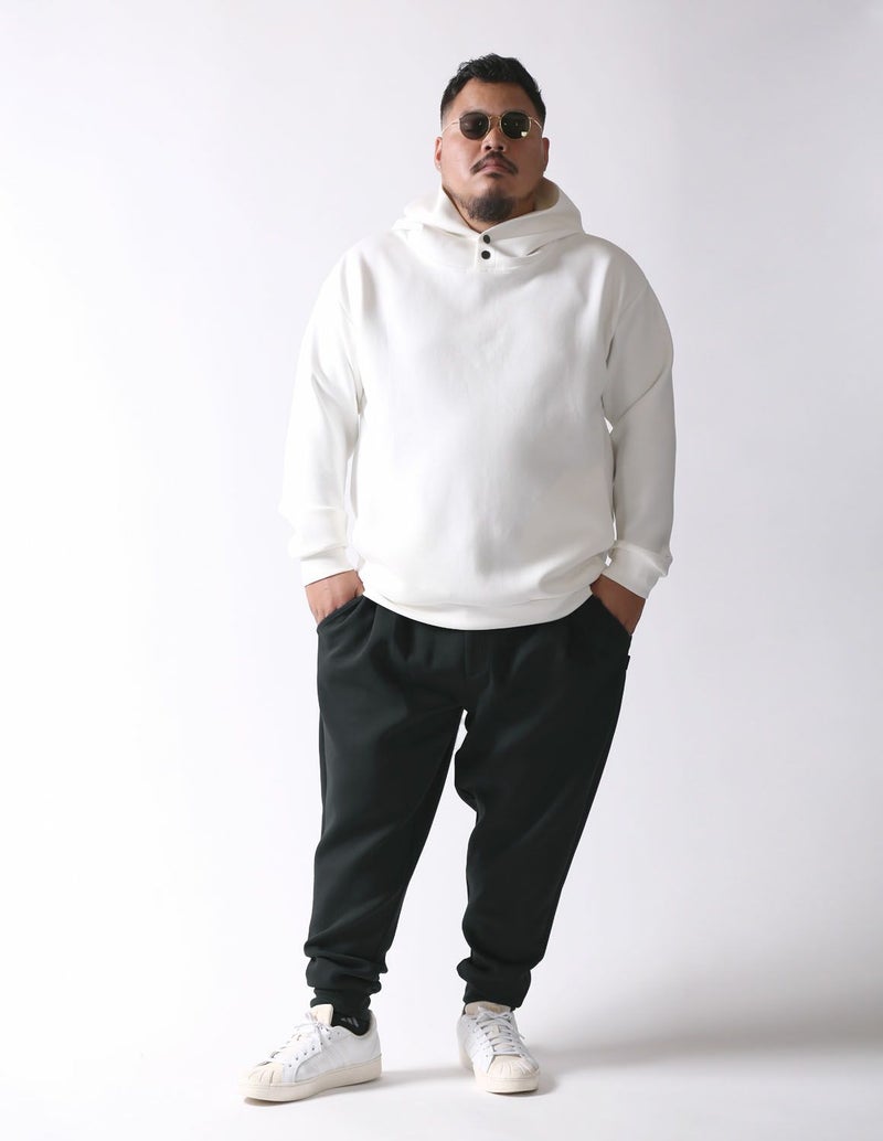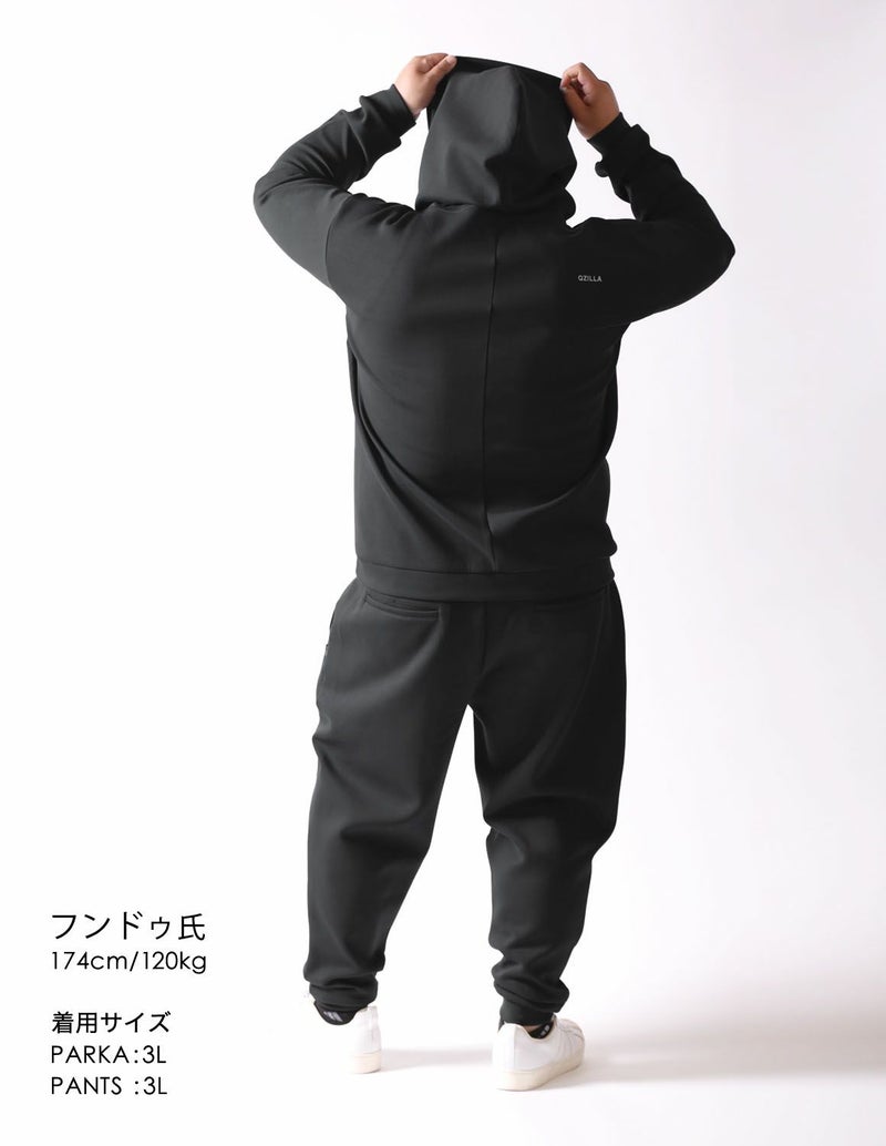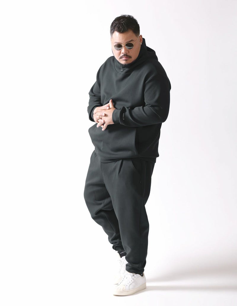 パーカーは存在感のある立体的なフード、首元の調節はボタンのデザインになっています。さらに左袖と右肩背面の部分にさりげなくラバープリントを施しています。ジョガーパンツは裾口にリブ、左サイドポケットの下部分にはピスネームを施しています。
