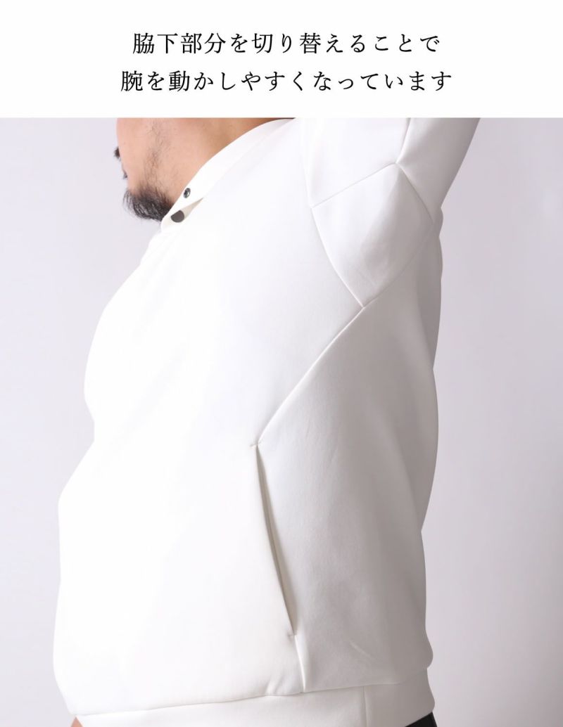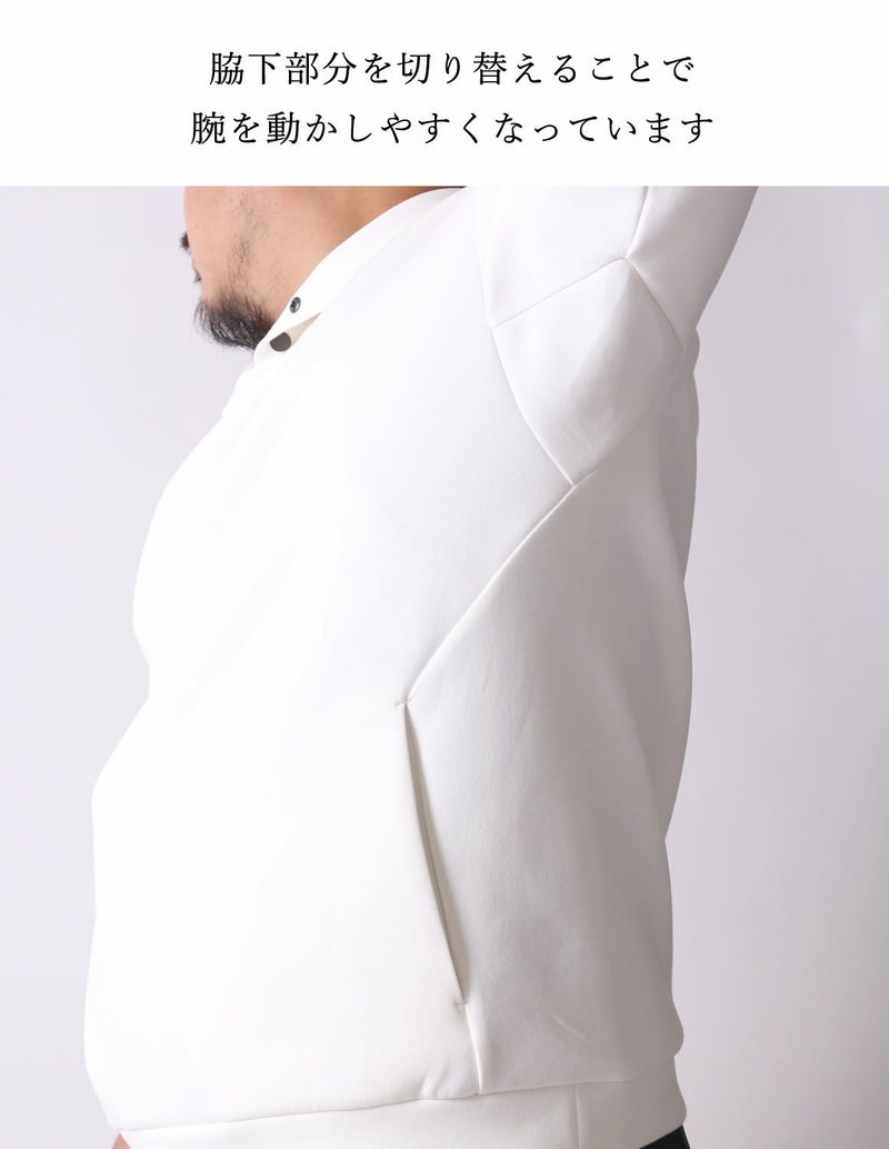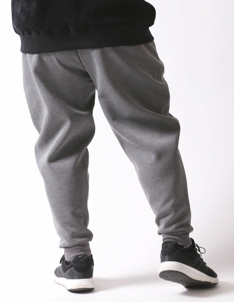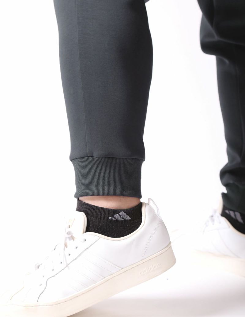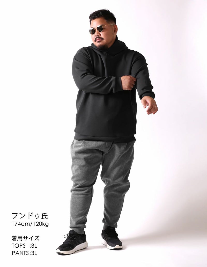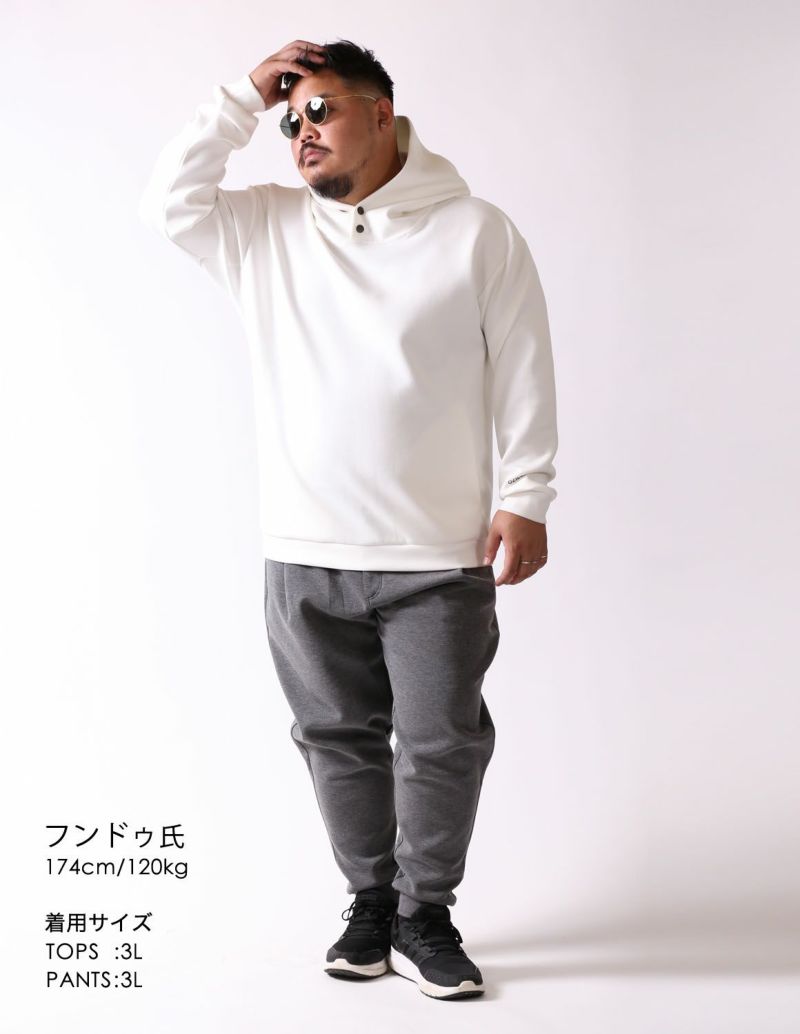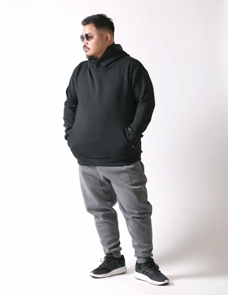 パーカーは存在感のある立体的なフード、首元の調節はボタンのデザインになっています。さらに左袖と右肩背面の部分にさりげなくラバープリントを施しています。ジョガーパンツは裾口にリブ、左サイドポケットの下部分にはピスネームを施しています。