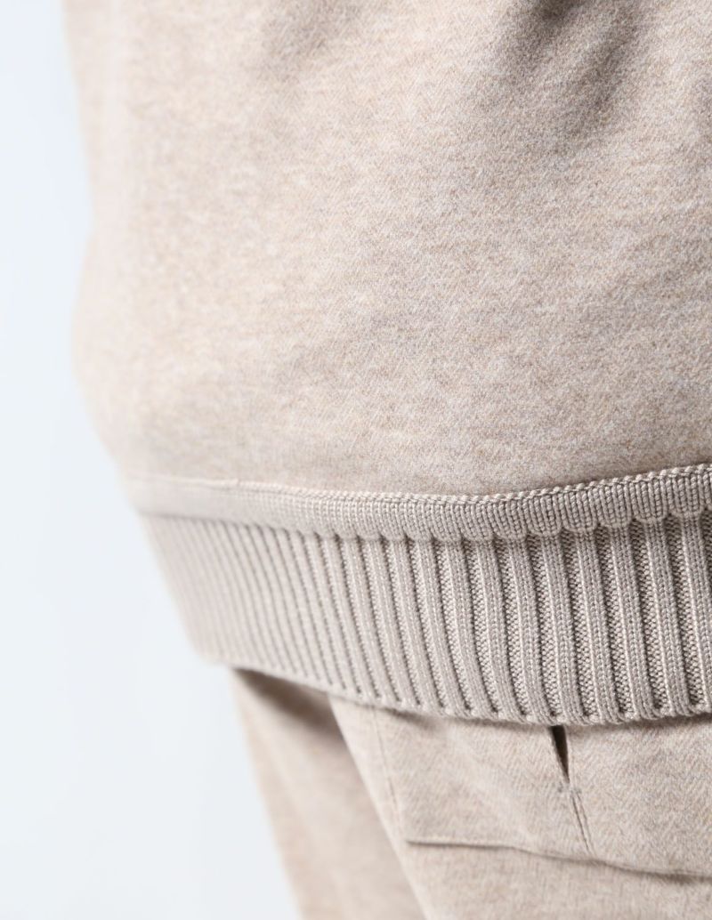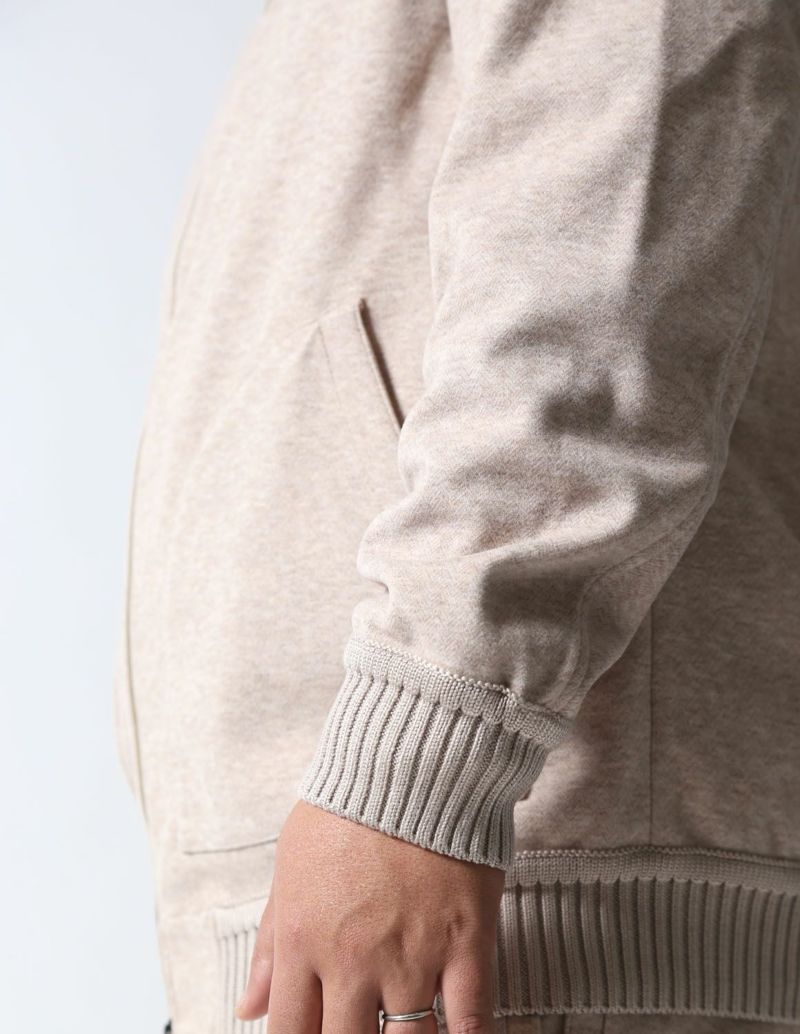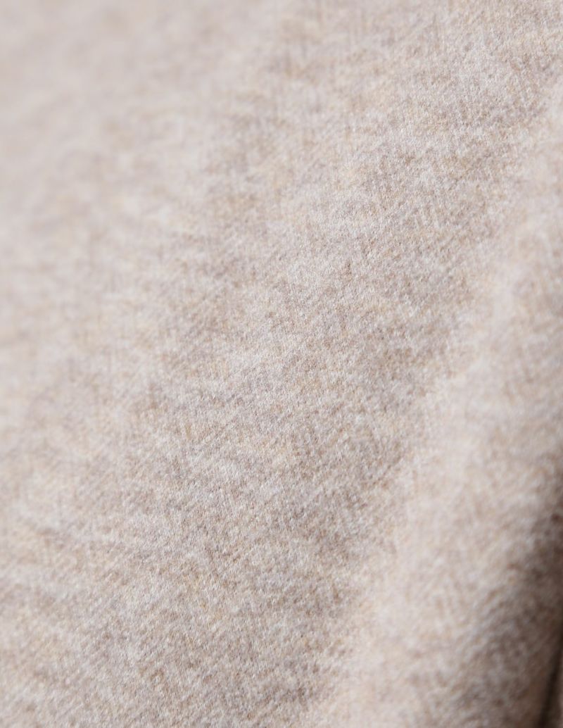 繊細なヘリンボーンの織柄が入った表地は、滑らかなタッチとニュアンスカラーが品ある面持。生地にマイクロピーチ起毛加工を施し、ウールライクな肌触りを実現しました。さらに伸縮するジャージ素材をボンディングで貼りあわせることで、膨らみ感のあるバルキーな生地感に仕上げ、保温性を確保し、かつストレスフリーな着心地に仕上げました。