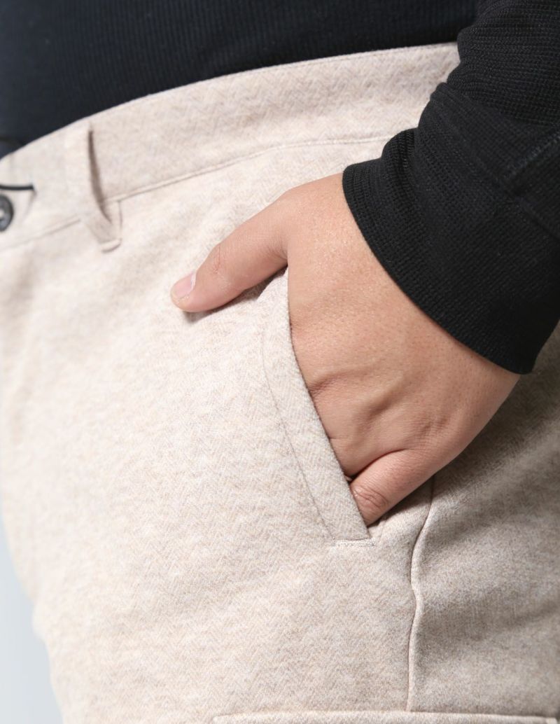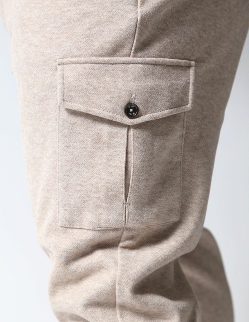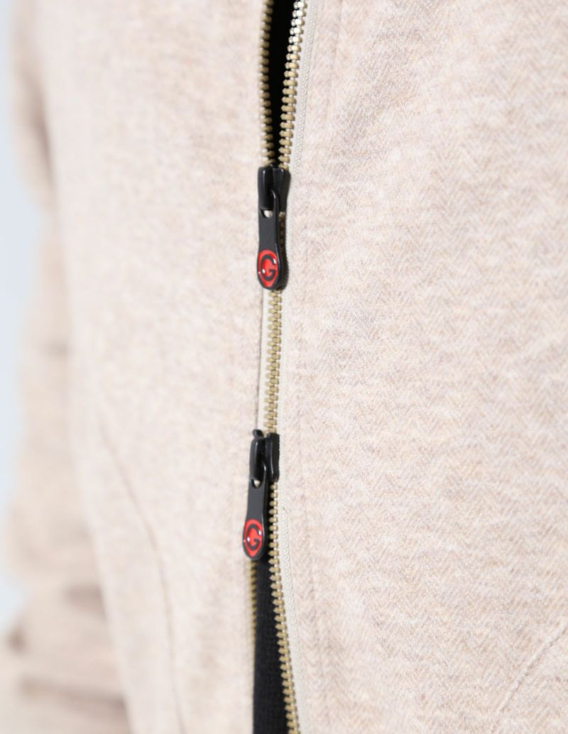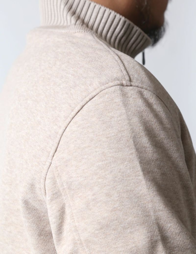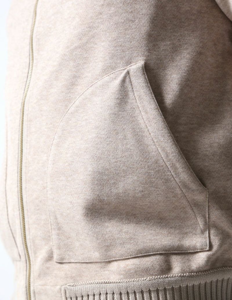 繊細なヘリンボーンの織柄が入った表地は、滑らかなタッチとニュアンスカラーが品ある面持。生地にマイクロピーチ起毛加工を施し、ウールライクな肌触りを実現しました。さらに伸縮するジャージ素材をボンディングで貼りあわせることで、膨らみ感のあるバルキーな生地感に仕上げ、保温性を確保し、かつストレスフリーな着心地に仕上げました。
