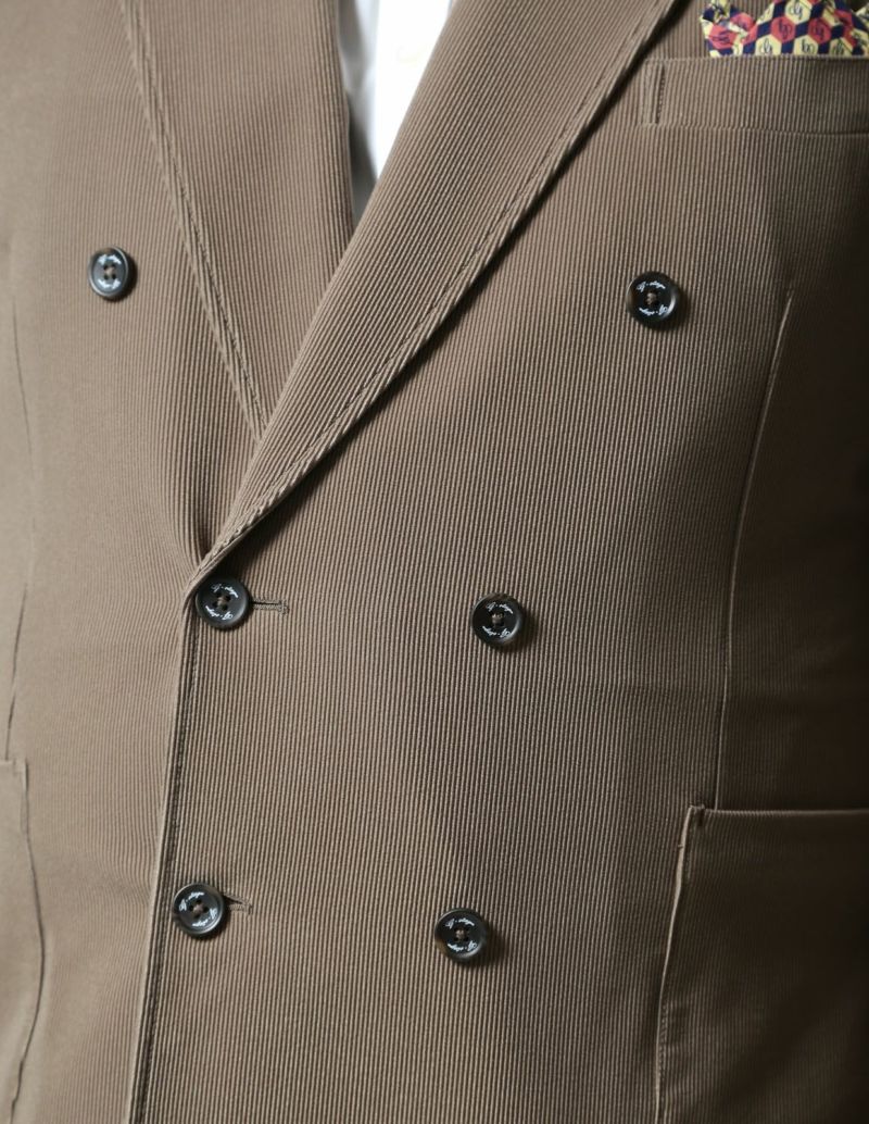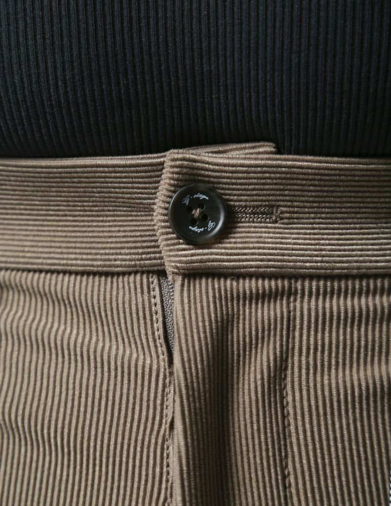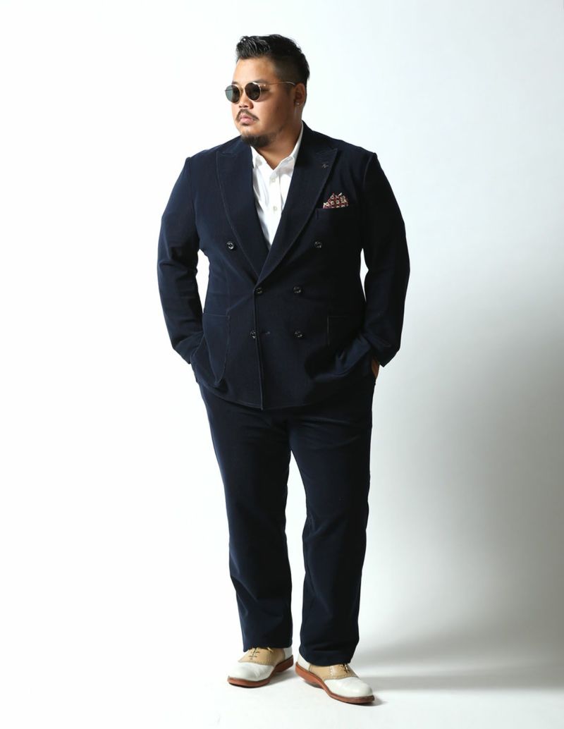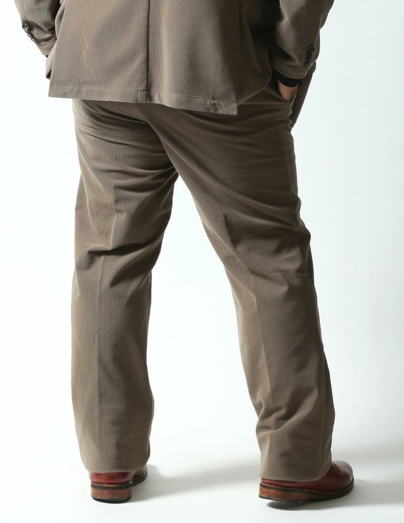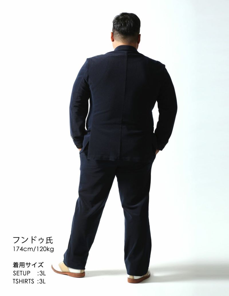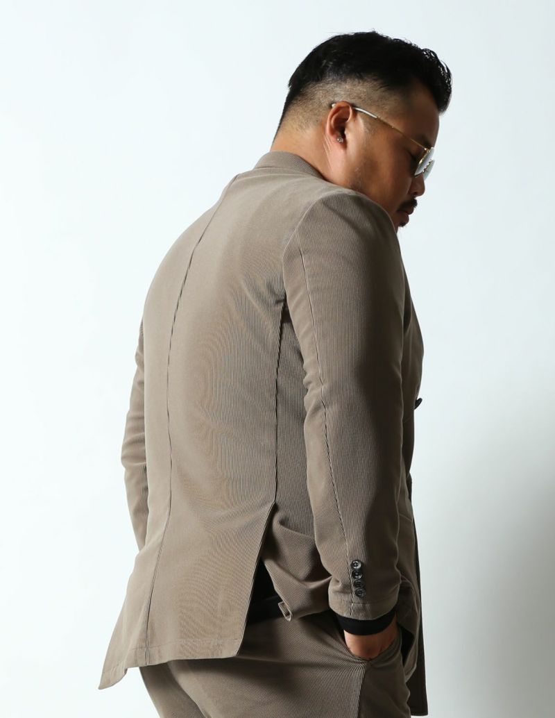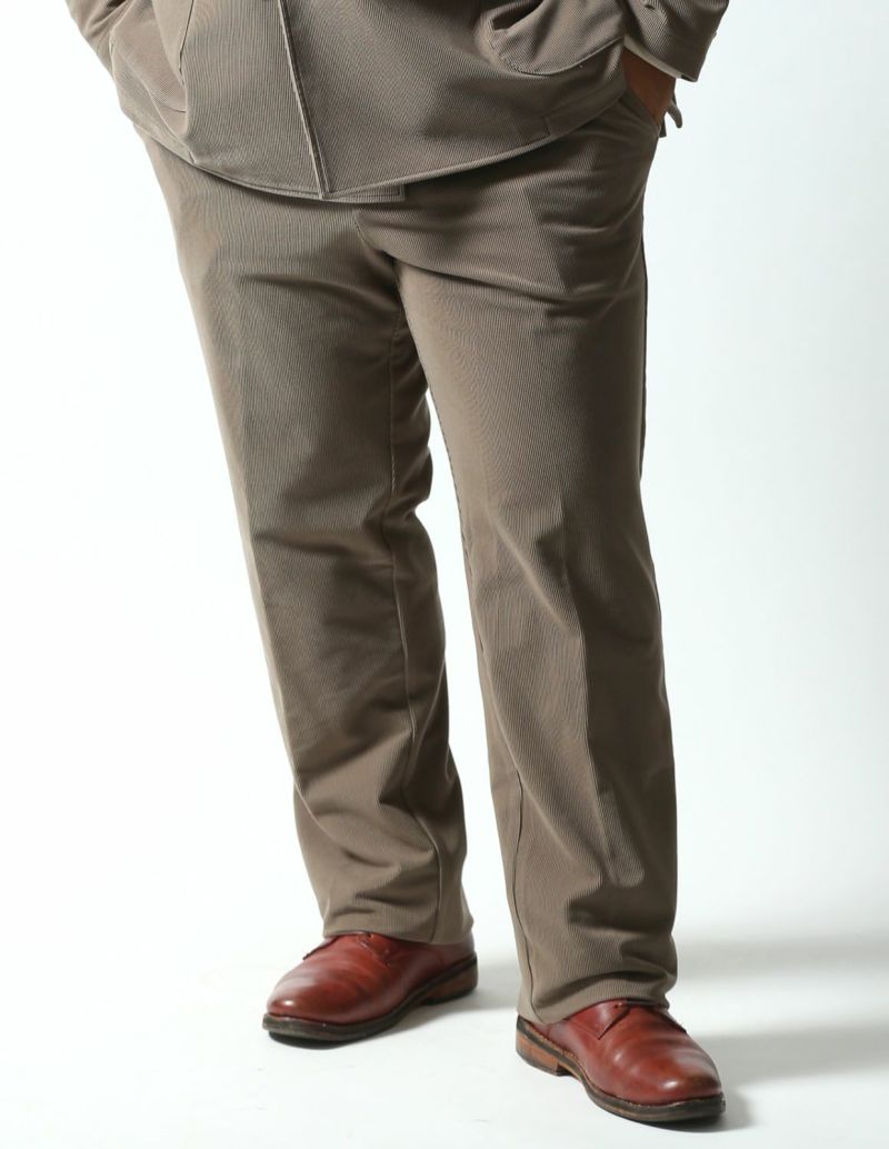 ニット生地でありながら、織物のようにしっかりした素材感が特徴の「トリコットニットコーデュロイ」を使用したセットアップが登場。
