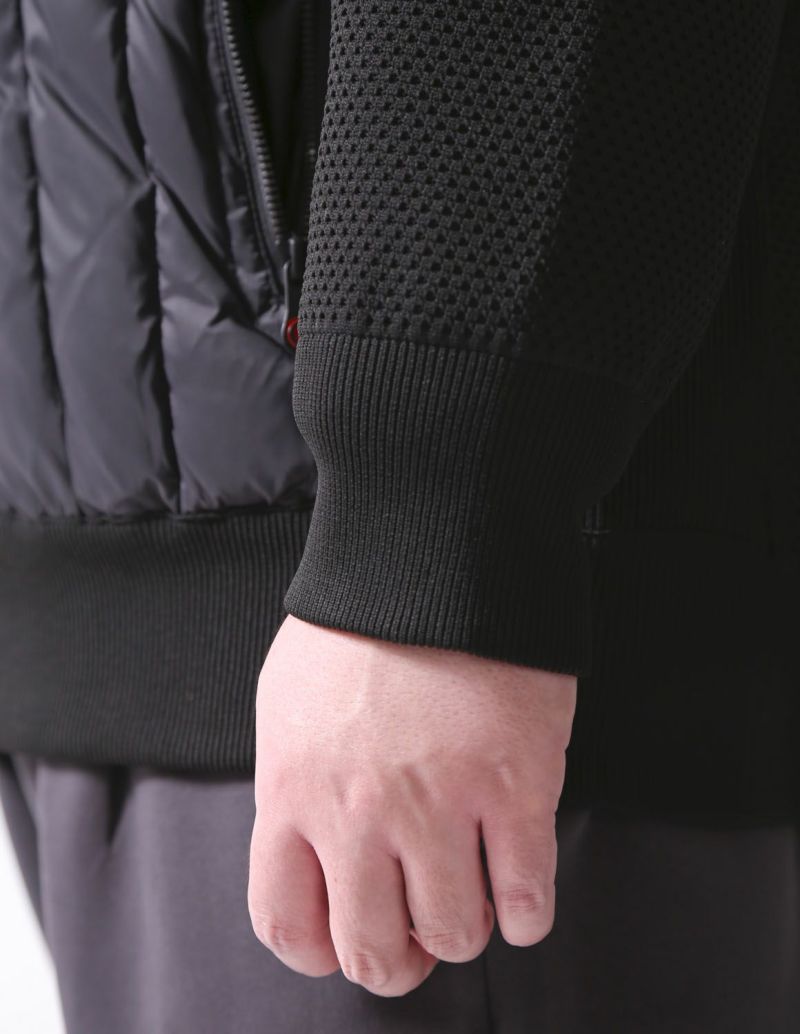 前身頃にナイロンタフタ+FP700以上の高品質ダウンを使用し、袖と後身には、ポリエステルの片畦ニットを採用することで、軽量で膨らみのある面持に。