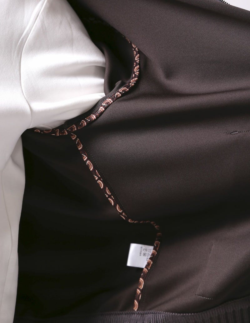 ネックや袖先、裾にリブが配されたスポーティーな印象のブルゾンですが、滑らかな素材感と上品な光沢感で、スタイリングが大人っぽくエレガントに仕上がるのが魅力。