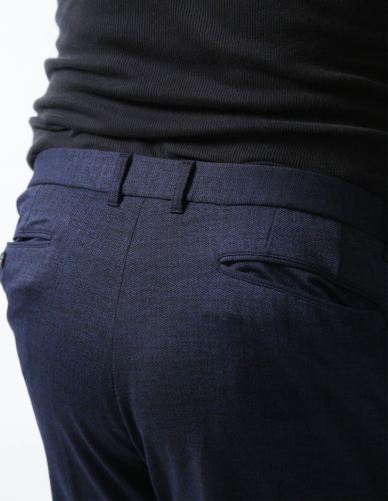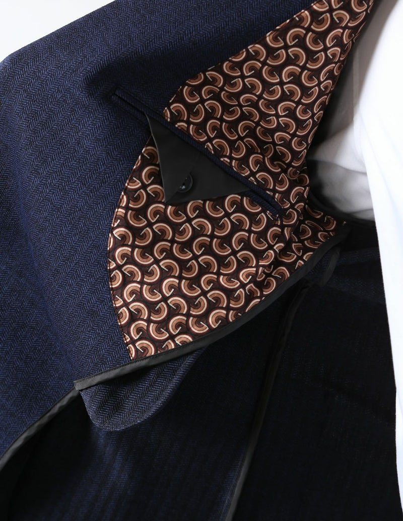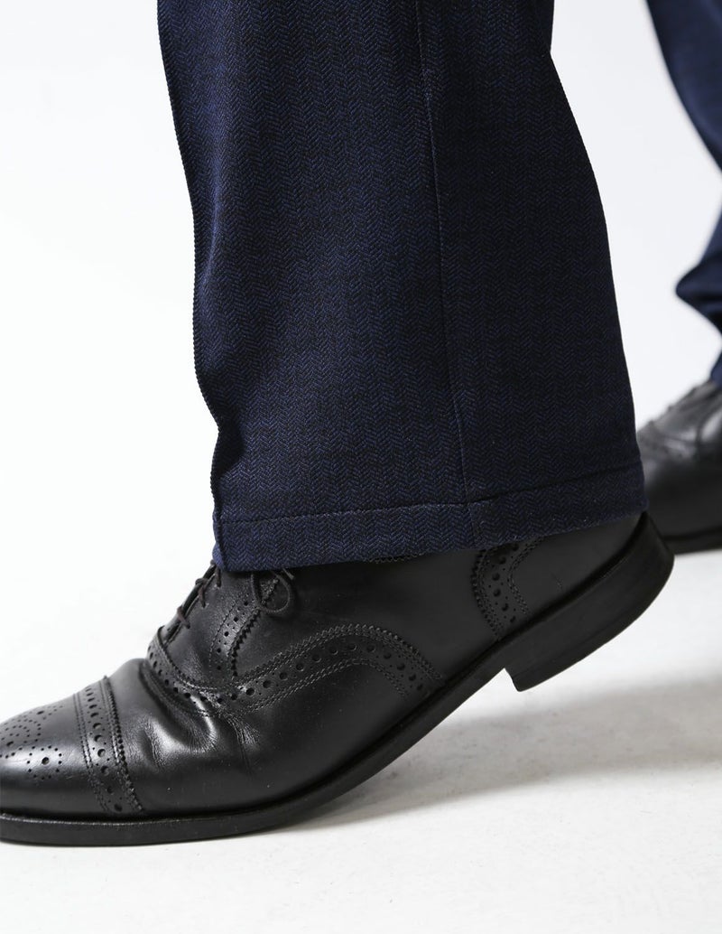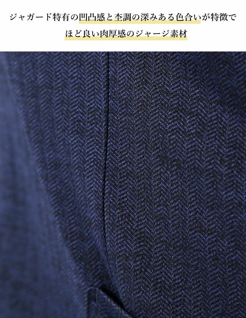 プリントではなく、ジャガードで表現されたヘリンボーン柄は、ジャガード特有の凹凸感と杢調の深みのある色合いが魅力。ほど良い肉厚感のジャージ素材で、体に沿って伸縮する快適な着心地を併せ持ったアイテムです。