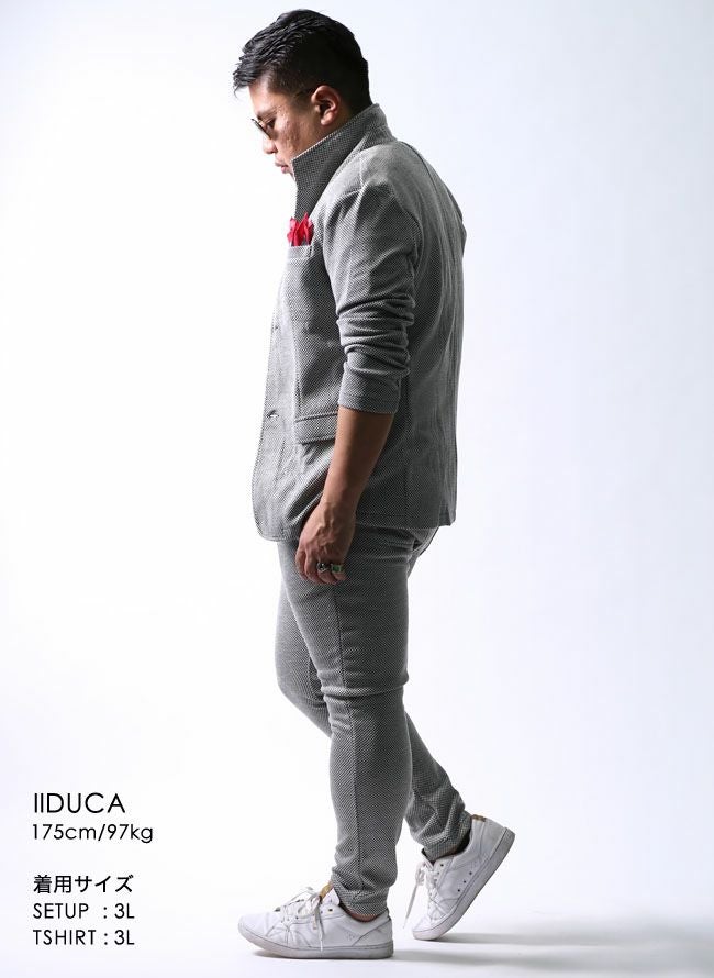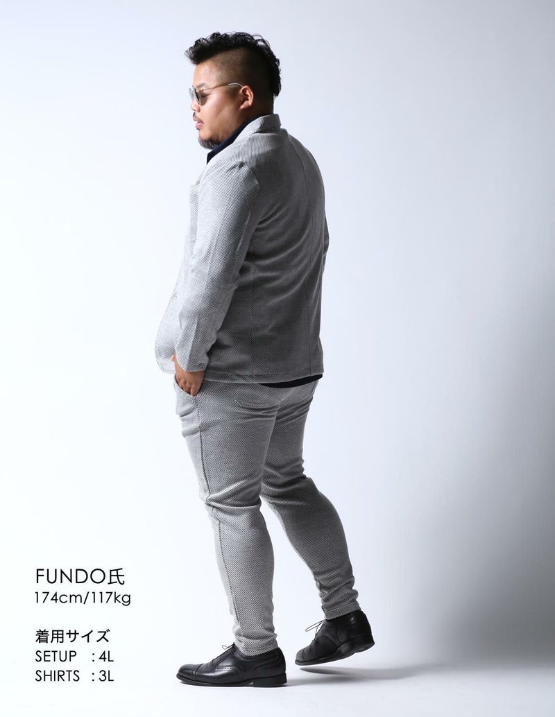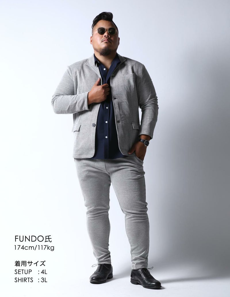 ジャケットは腕周りがかなりキツいですが、ストレッチがかなり効いてて、着込まなければ問題ありません。ボタン止めると胸周りも相当キツいです。丈も含めて他はピッタリです。