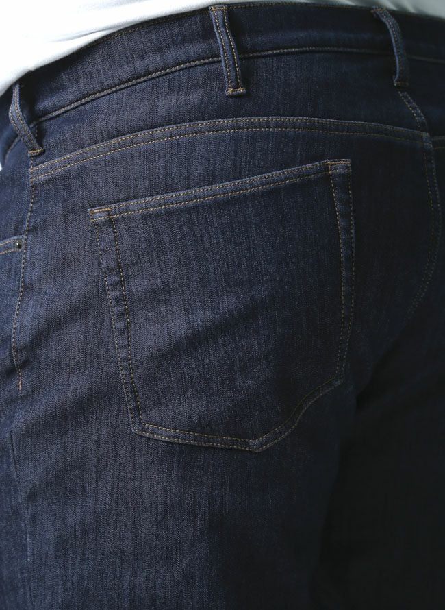 表地は適度な収縮率のあるストレッチデニムを使用 。カラダの動きにも無理なくフィットして快適な穿き心地 です 。