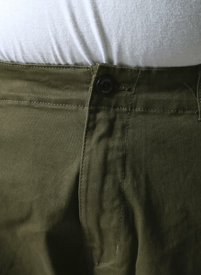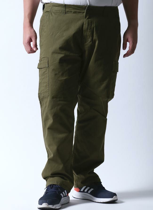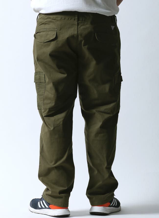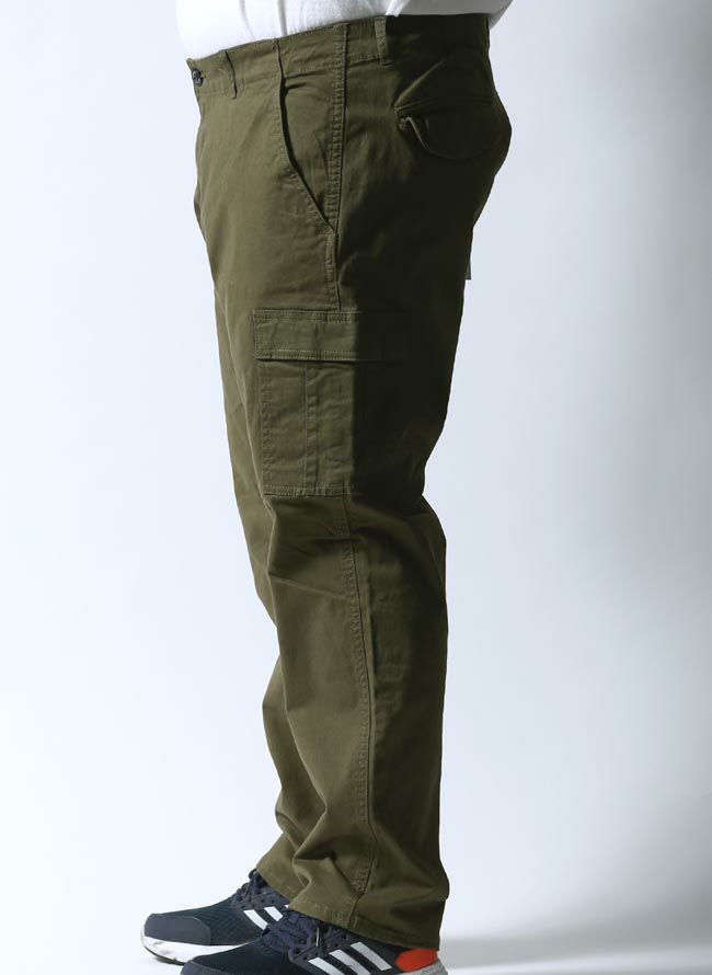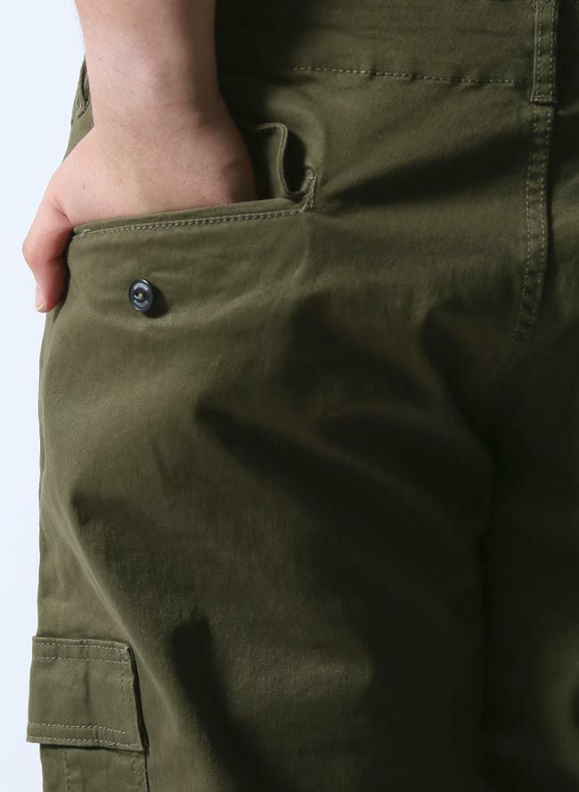 サイドにフラップのポケットが付いたカーゴパンツでストレートのシルエットでチノ素材を使用。