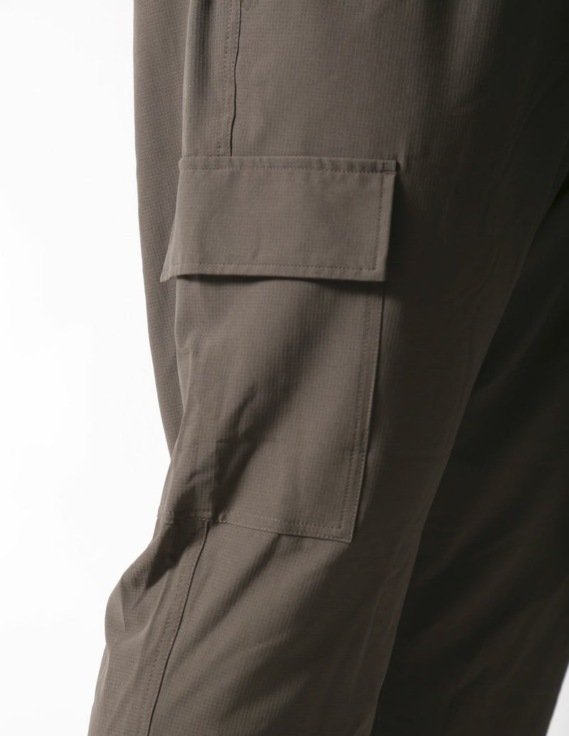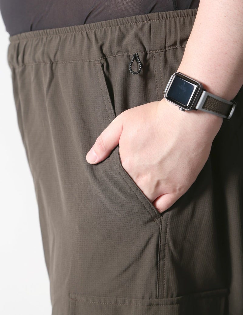 縦にも横にも伸びるストレッチの効いたサラッとした風合いの凹凸感のあるポリリップストップ素材を使用したカーゴパンツ。