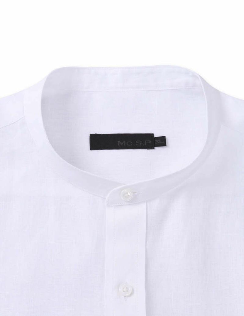 通常のシャツのような三角の襟ではなく、帯(バンド)のような形の襟で首元に丸みがあり柔らかい印象を演出してくれます。