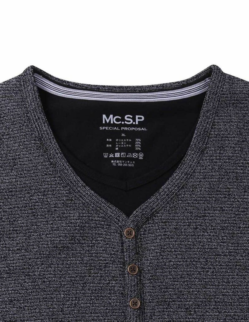 襟もとは1枚で重ね着風にみえるお洒落なフェイクレイヤードデザインで、パッと見ヘンリーネックに見えるようアレンジされたクルーネックTシャツになっています。