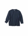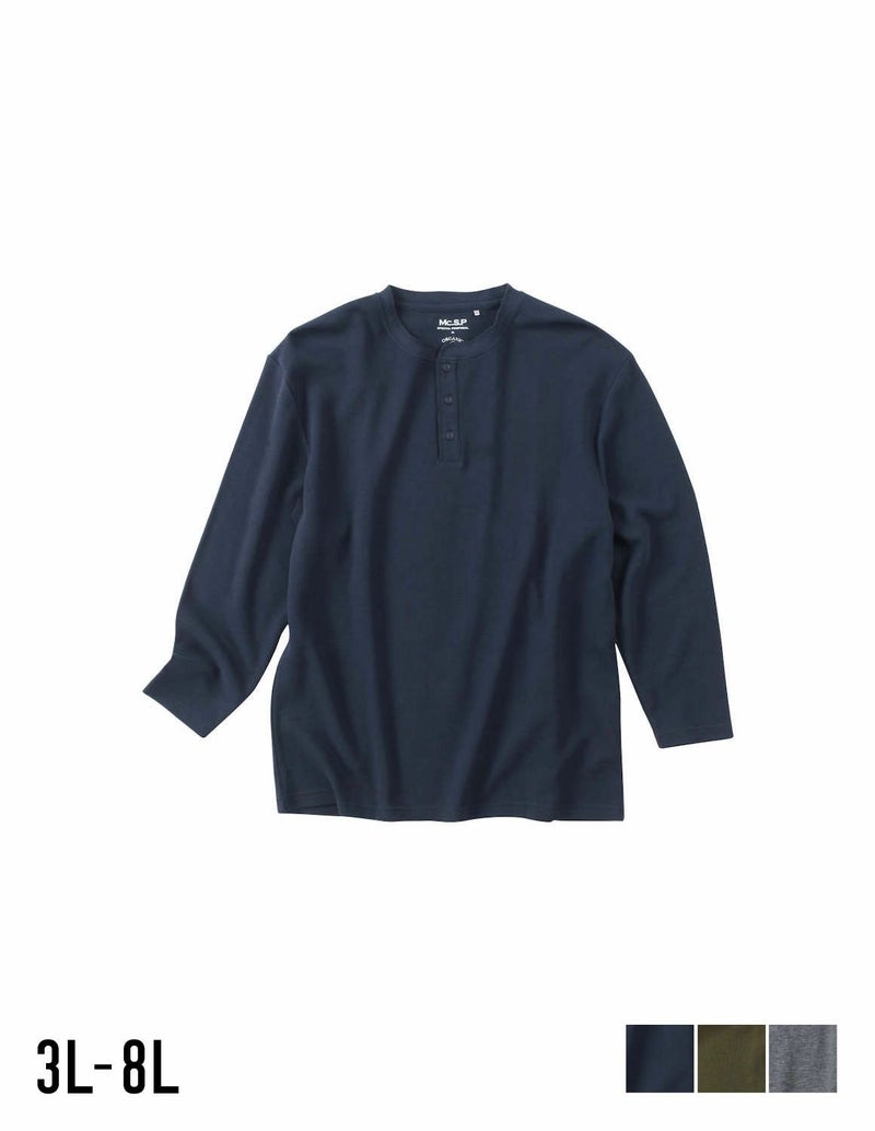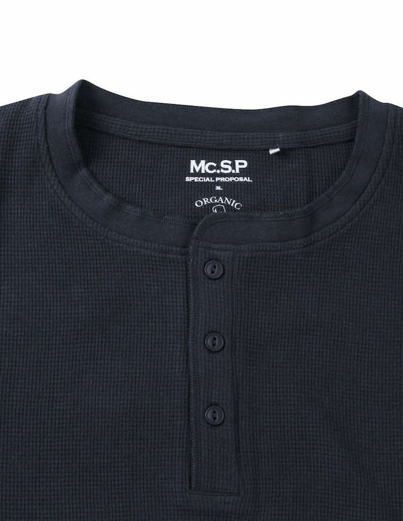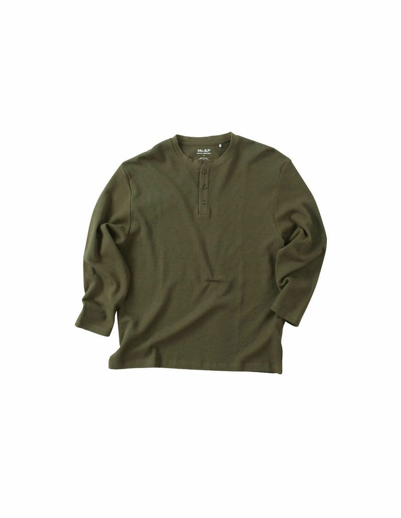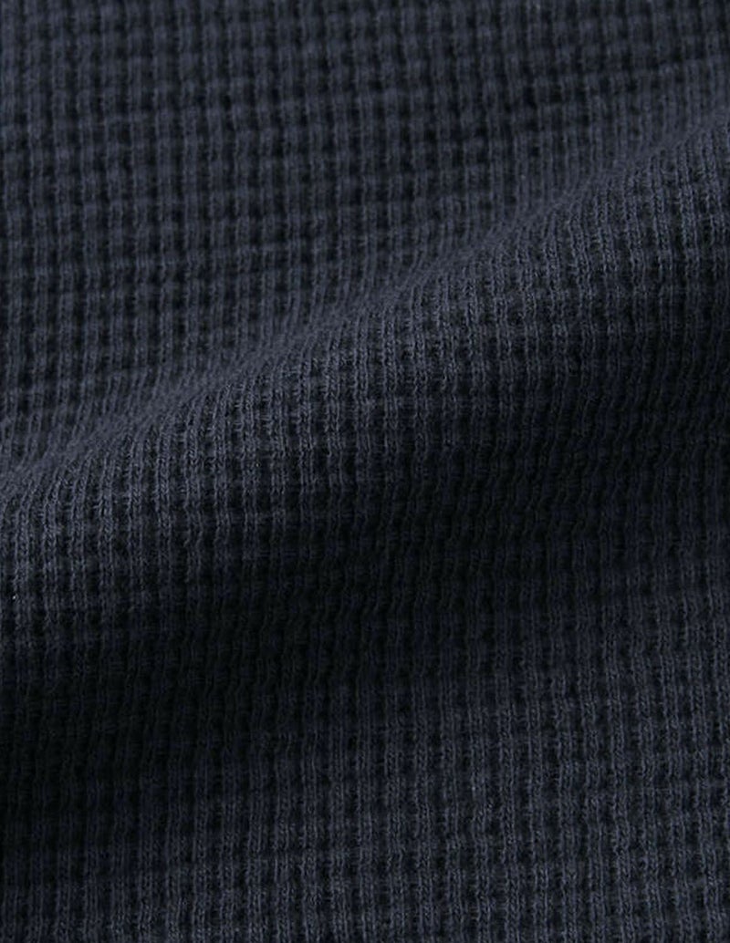 ワッフル生地の編地は横伸びし易いので、楽な着心地。首元に余裕のあるヘンリーネックデザイン。