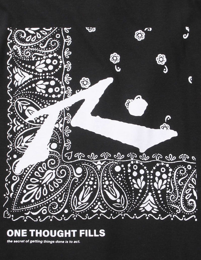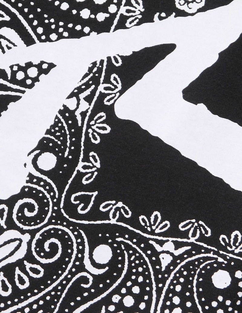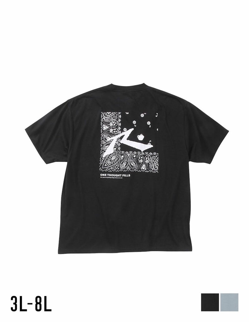 派手さを抑えたカラーリングにバンダナ柄のグラフィックプリントが印象的なクルーネックTシャツ。