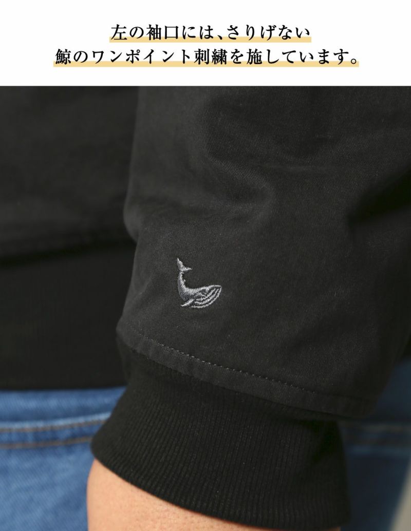 また見落としがちなんですが、左の袖のところにワンポイントでクジラの刺繍があまり主張しない色で入っているのが、武骨な中に遊び心みたいでいいですね。