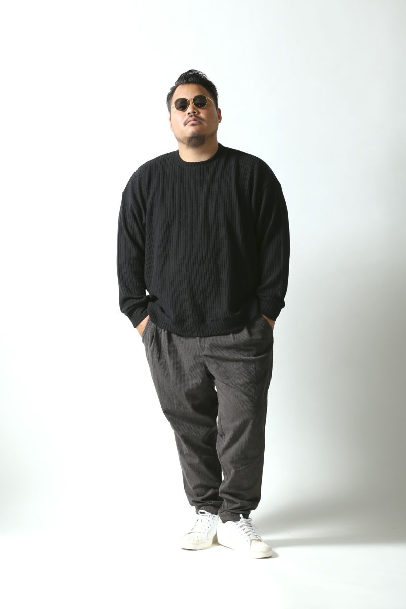ストライプ状の凹凸表情が特長の生地を使用したワイドシルエットの「魅了グリズリー 」ニットソー風ロングスリーブTシャツが登場。