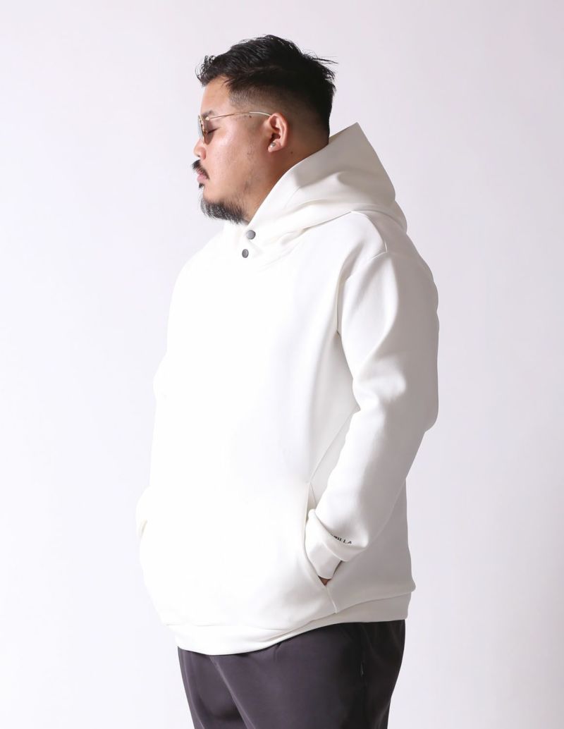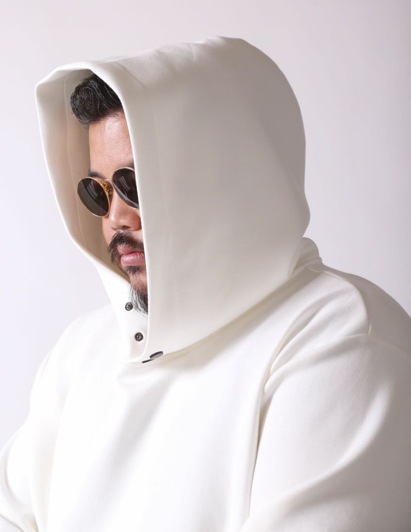 立体感のあるフードやボタン仕様の首元、さらに左袖と右肩背面に施したラバープリントなど、細部に大人の遊び心をプラス。