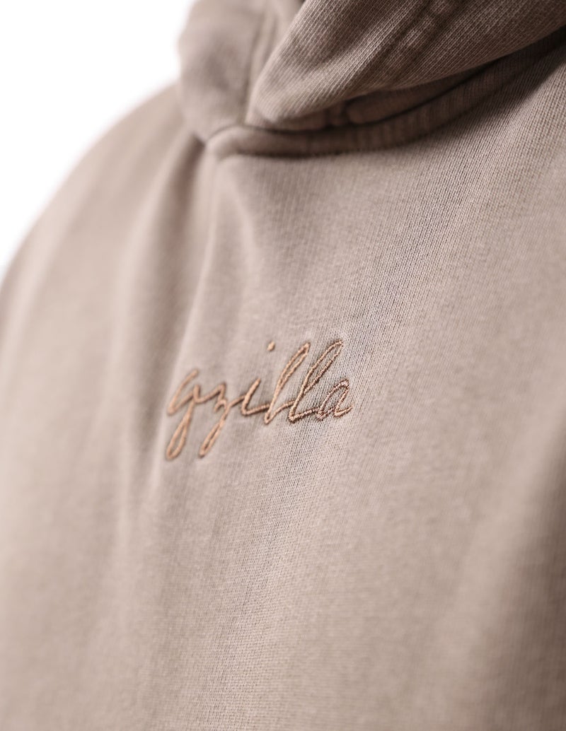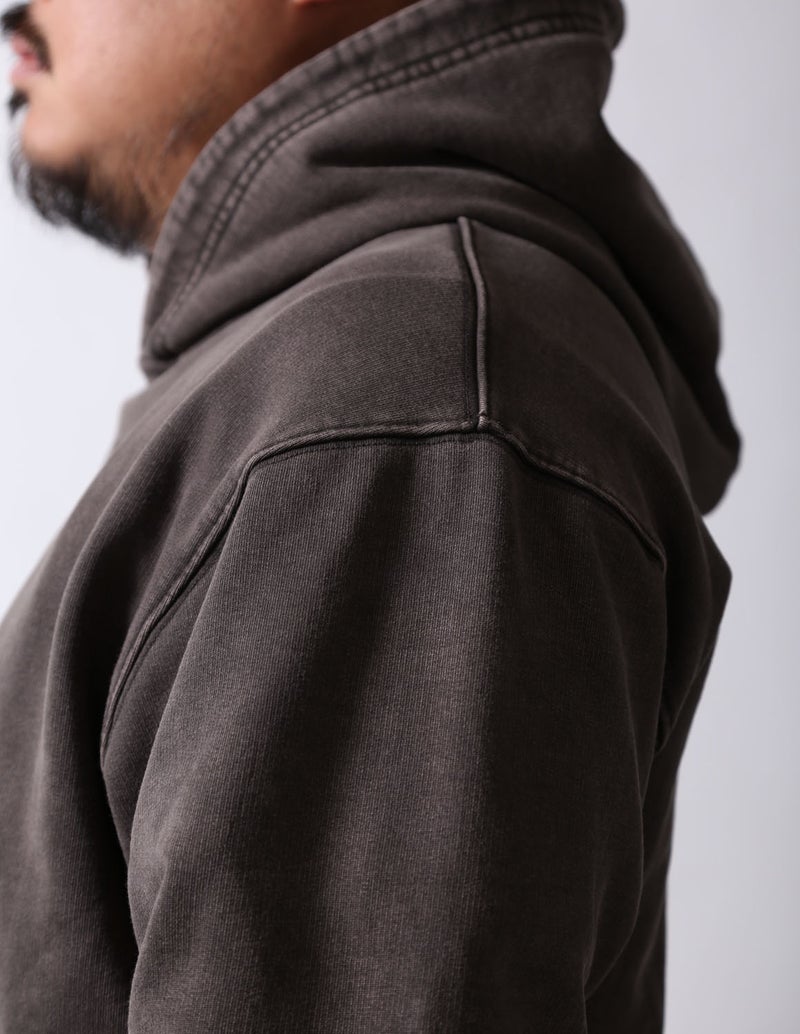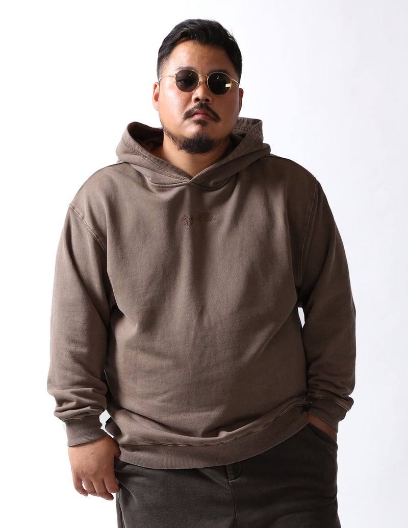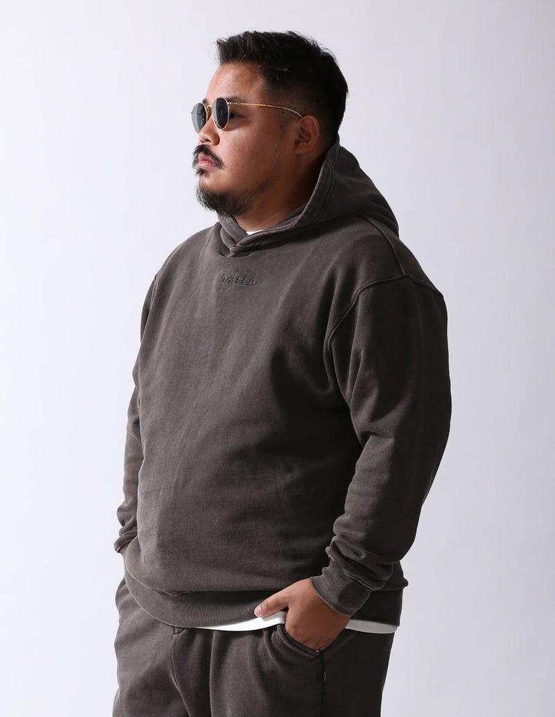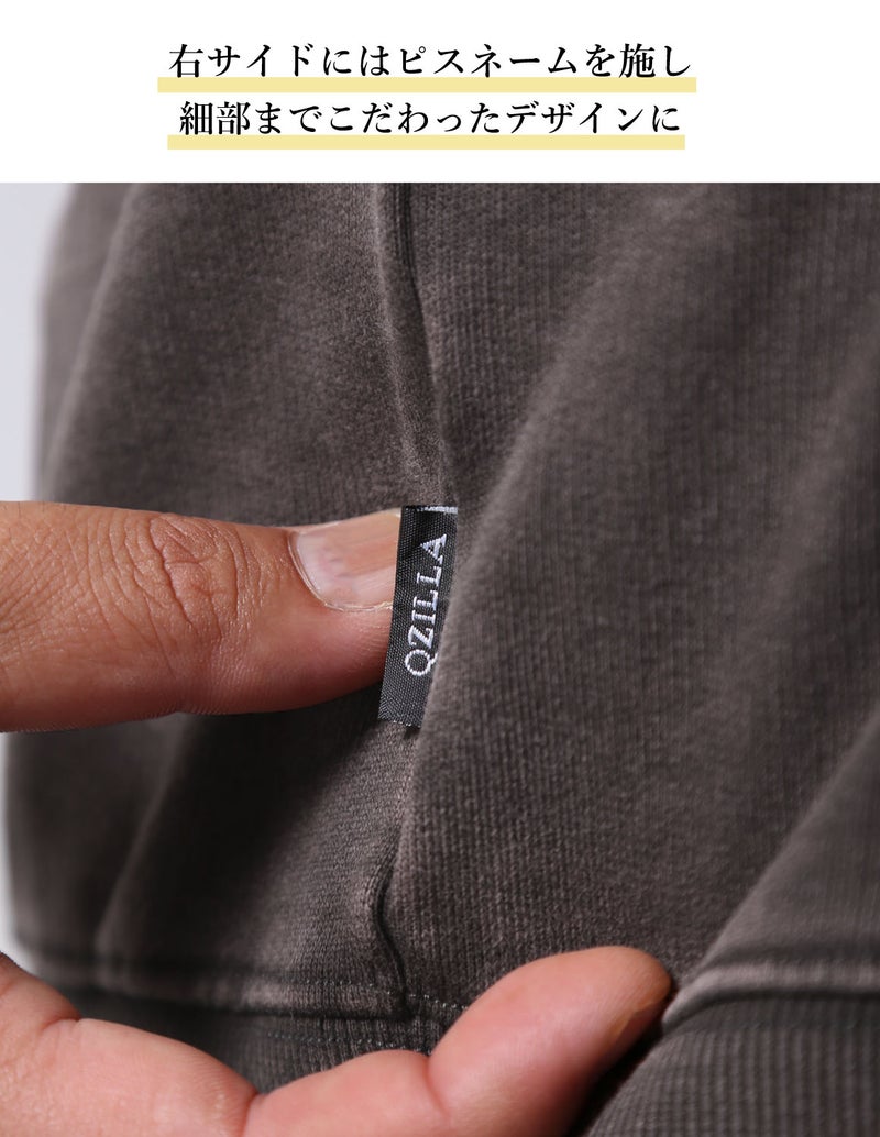 胸元の筆記体の「qzilla」刺繍とピスネームを施した大人の為のシンプルなデザイン。程よい風合いが、普通のパーカーと一線を画す。