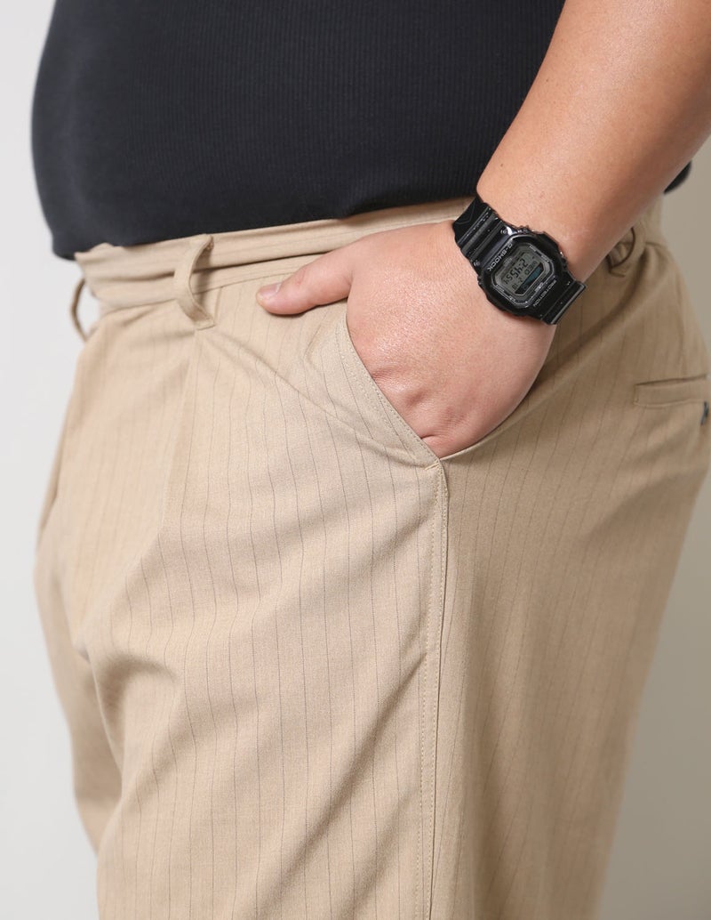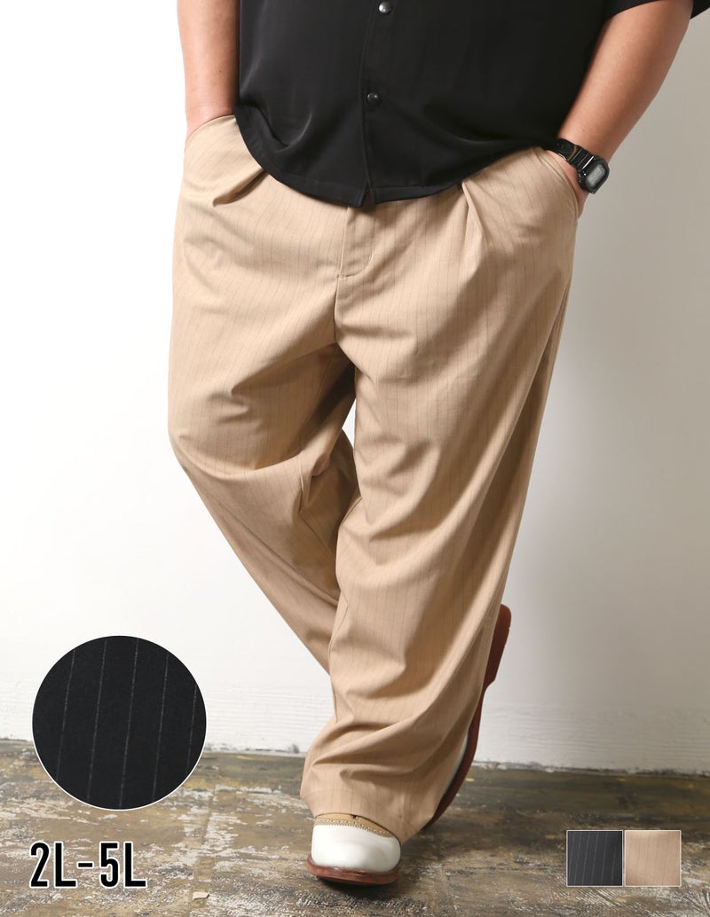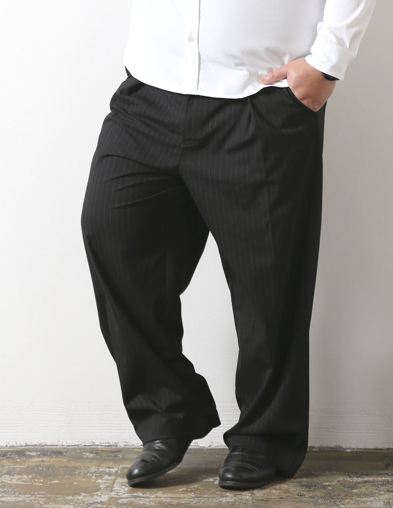 ピンストライプのキレイ目デザインのパンツ。細過ぎず、太過ぎない品格漂うストレートシルエットを採用。