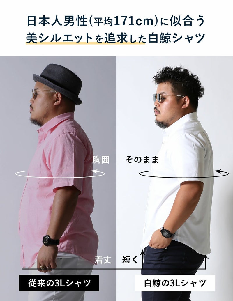 172cm,100kgの太目体型です。クジラでのサイズは3Lがバッチリです。2年ほど前から白鯨シャツと感鯨パンツ、スーツなどを愛用しています。感鯨パンツも5~6本あって、ほとんど毎日、クジラです。