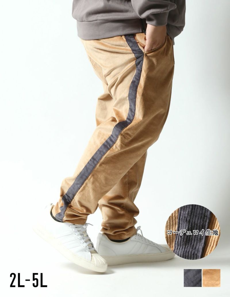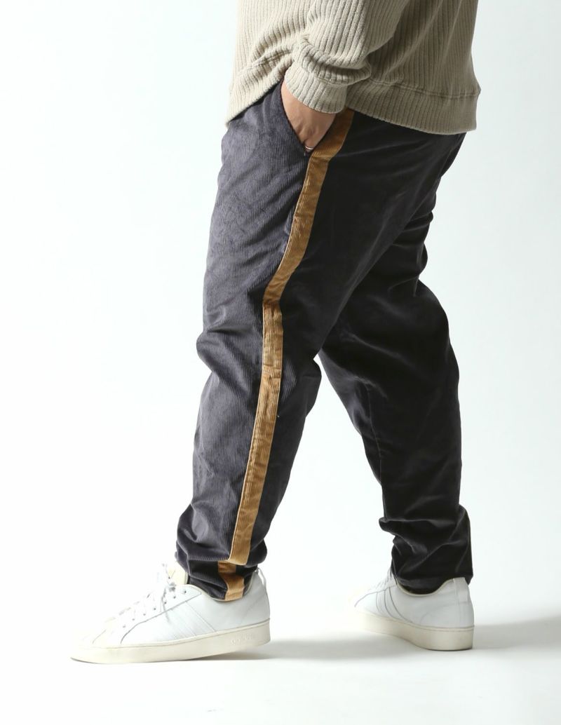 秋冬シーズンのスタイリングに最適なコーデュロイ生地とサイドラインを入れたデザインでストリート感をミックスした印象のカジュアルな仕上がり。