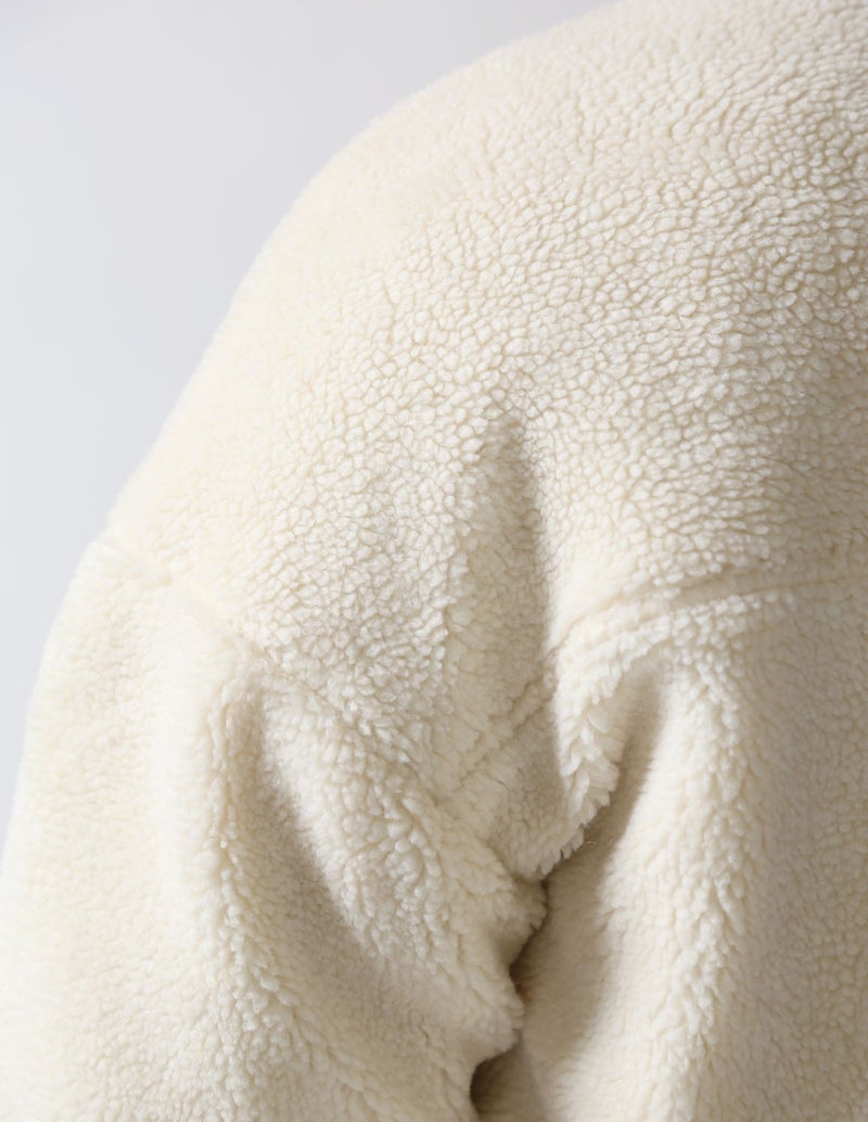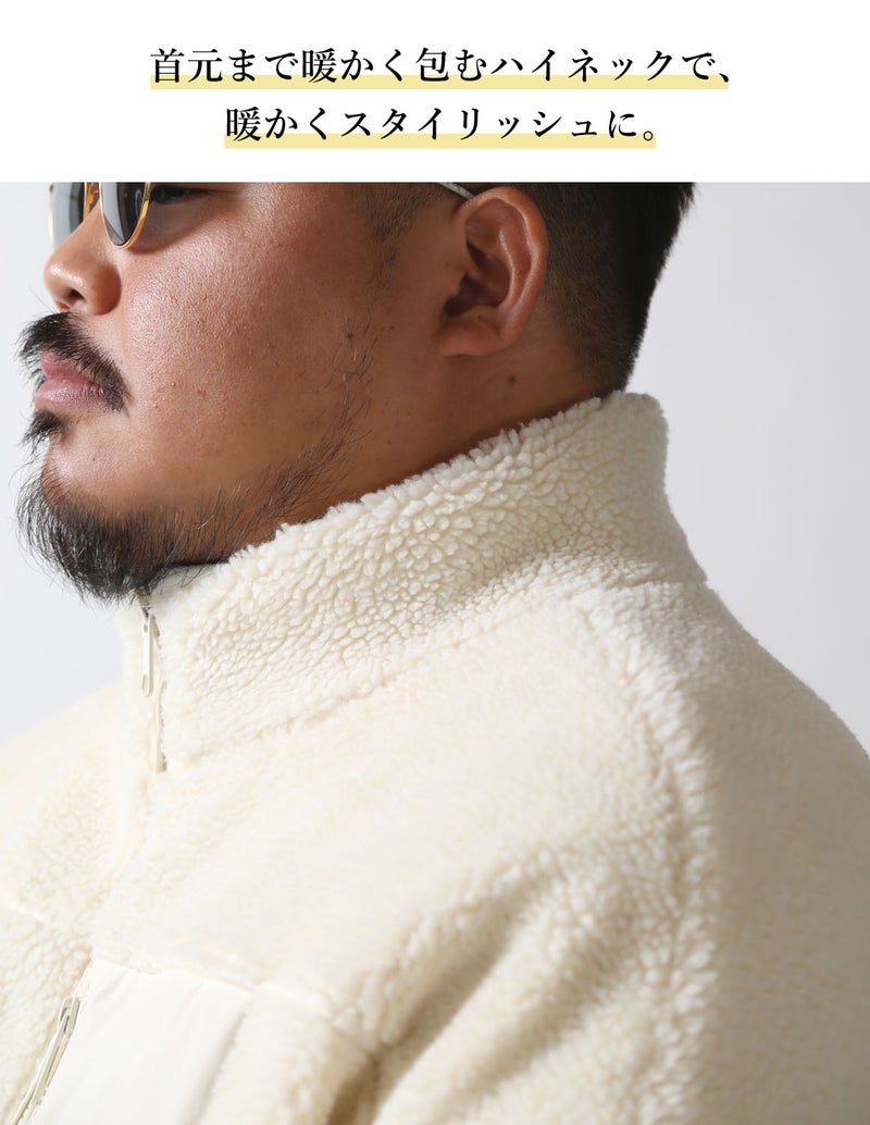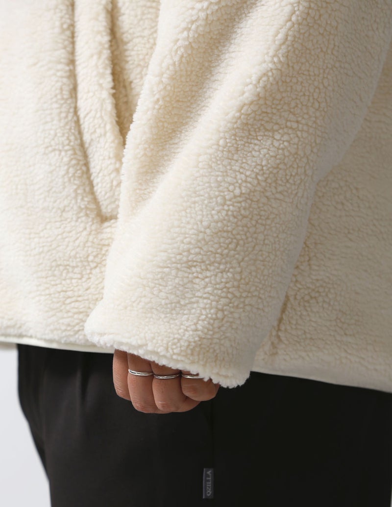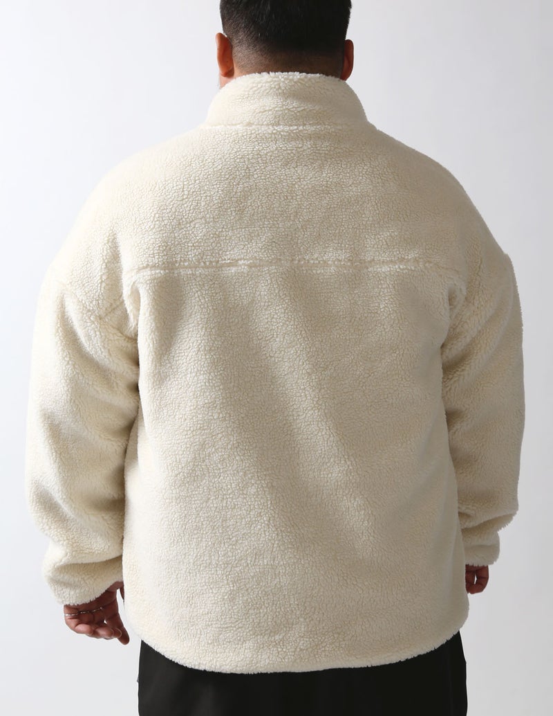 柔らかく暖かみのあるボアフリースを使用し、ハイネック・異素材のポケット・ラバーワッペンが特徴的なデザイン。
