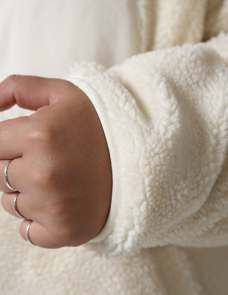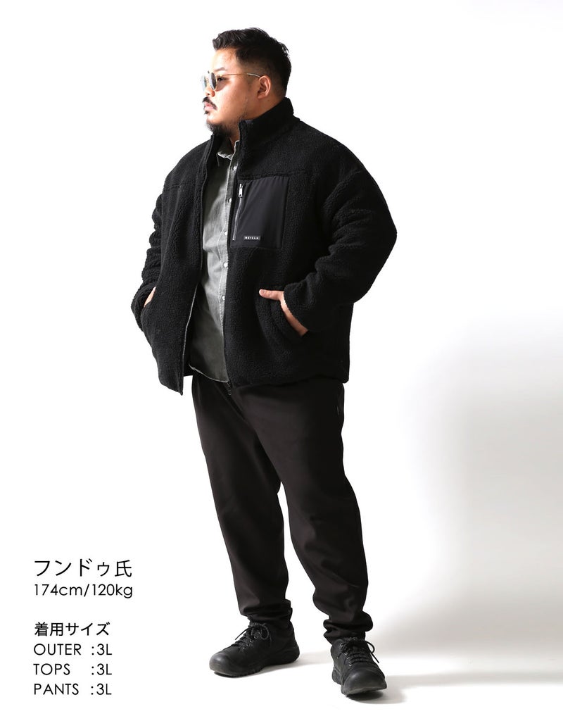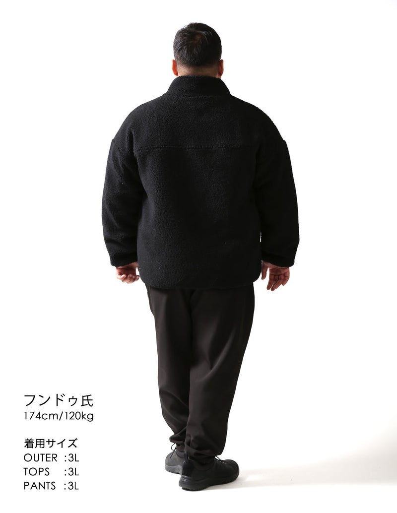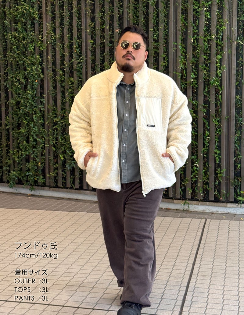 柔らかく暖かみのあるボアフリースを使用し、ハイネック・異素材のポケット・ラバーワッペンが特徴的なデザイン。