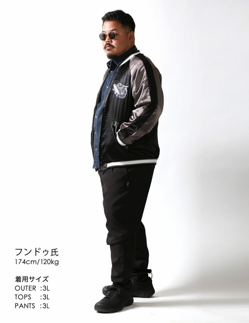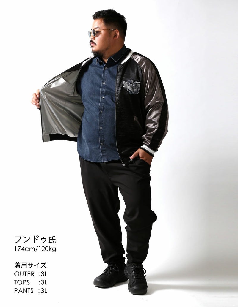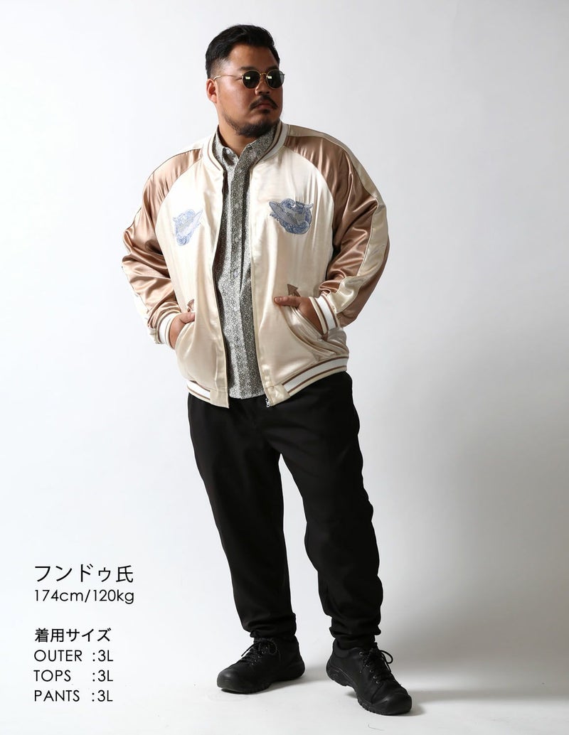 驚く程なめらかな生地と肌ざわりの良さ、シルエットの美しさに惹かれました。届いてから気づいたのですが裏地もしっかりしていて、背中のクジラの刺繍の見た目は勿論、面に指で触れて確実に判る品質の高さ。スカジャンは他にも所有していますが、全然。そんじょそこらのそれらとは格が違います。街中でもまずかぶらない特別感。