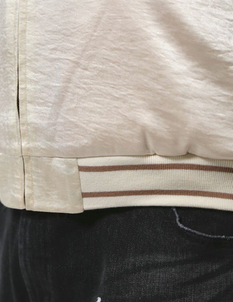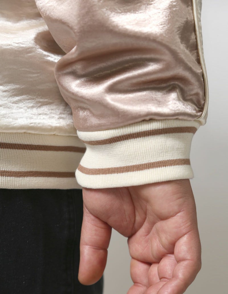 こだわりの刺繍を背面と両胸に施しました。シンプルな刺繍の色使いで大人のスカジャン。