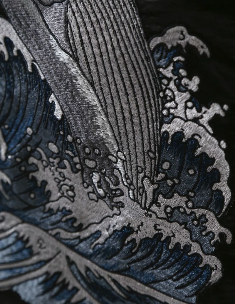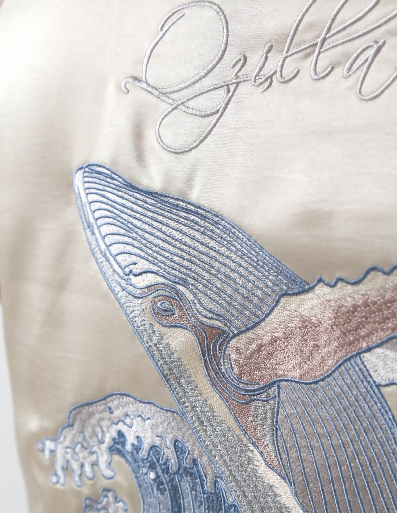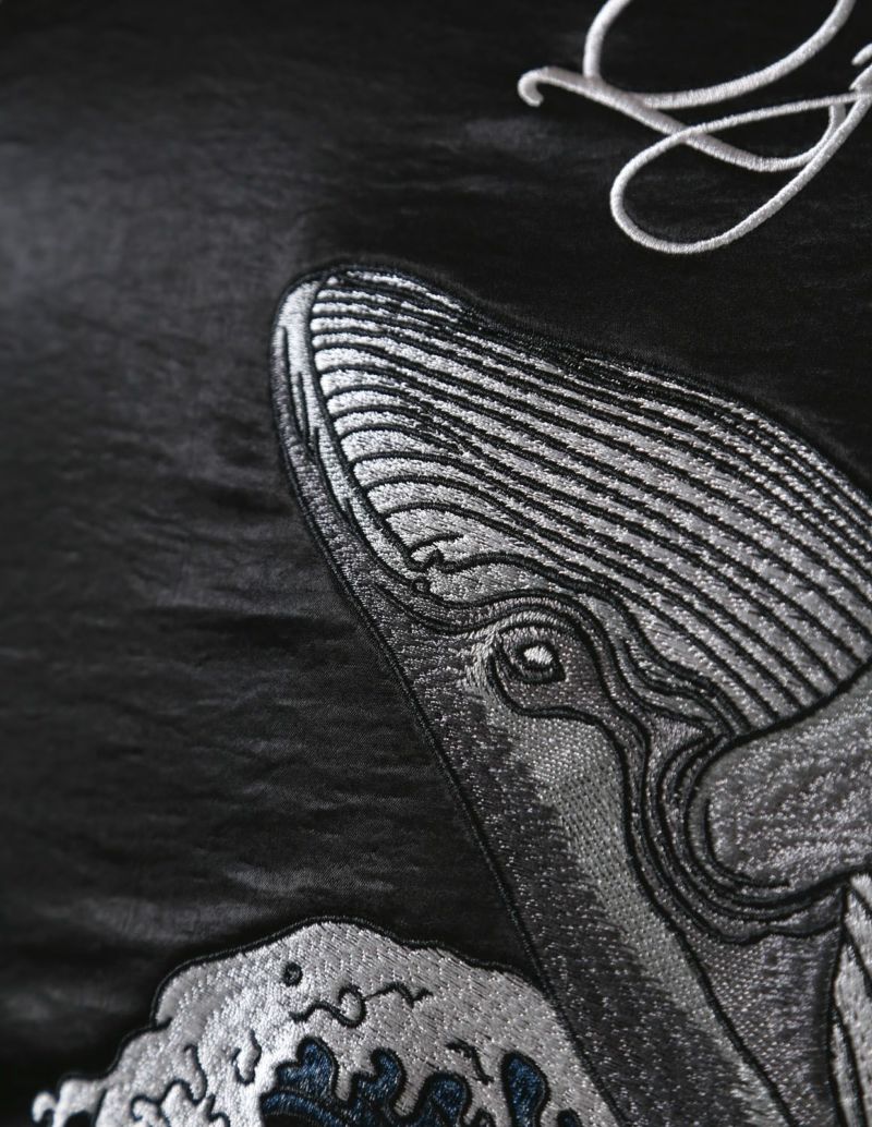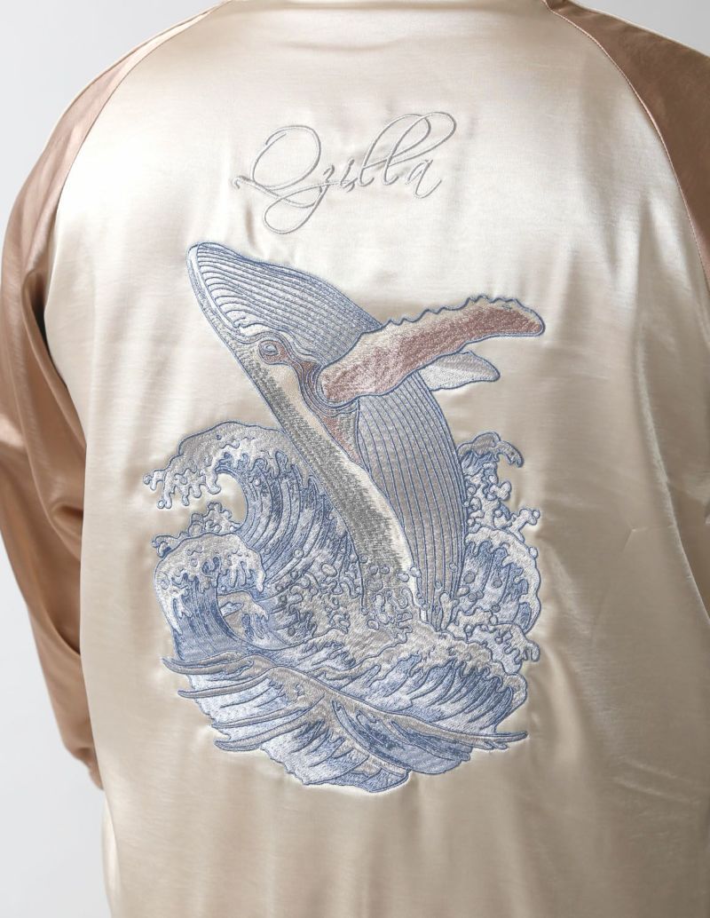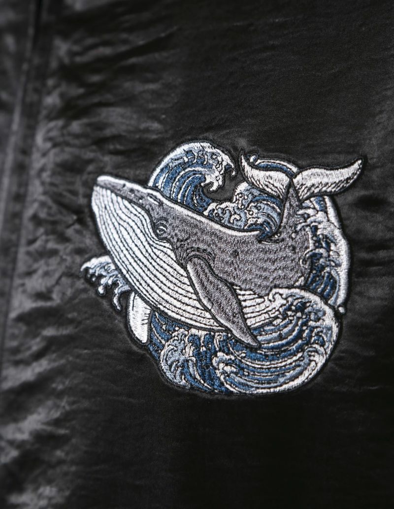 QZILLAオリジナルの今までありそうで無かった鯨の刺繍を背面と両胸にあしらった「極鯨スカジャン」
