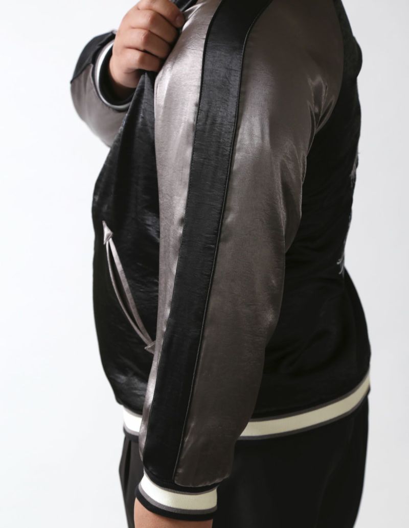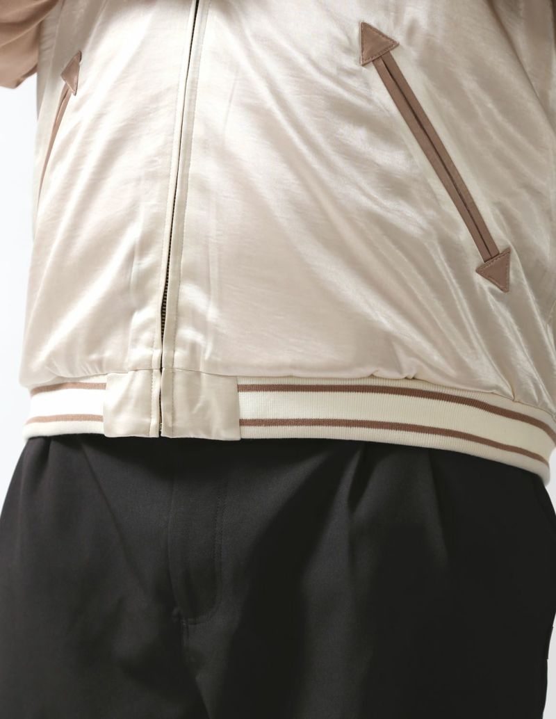 こだわりの刺繍を背面と両胸に施しました。シンプルな刺繍の色使いで大人のスカジャン。