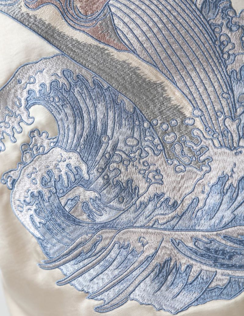 驚く程なめらかな生地と肌ざわりの良さ、シルエットの美しさに惹かれました。届いてから気づいたのですが裏地もしっかりしていて、背中のクジラの刺繍の見た目は勿論、面に指で触れて確実に判る品質の高さ。スカジャンは他にも所有していますが、全然。そんじょそこらのそれらとは格が違います。街中でもまずかぶらない特別感。