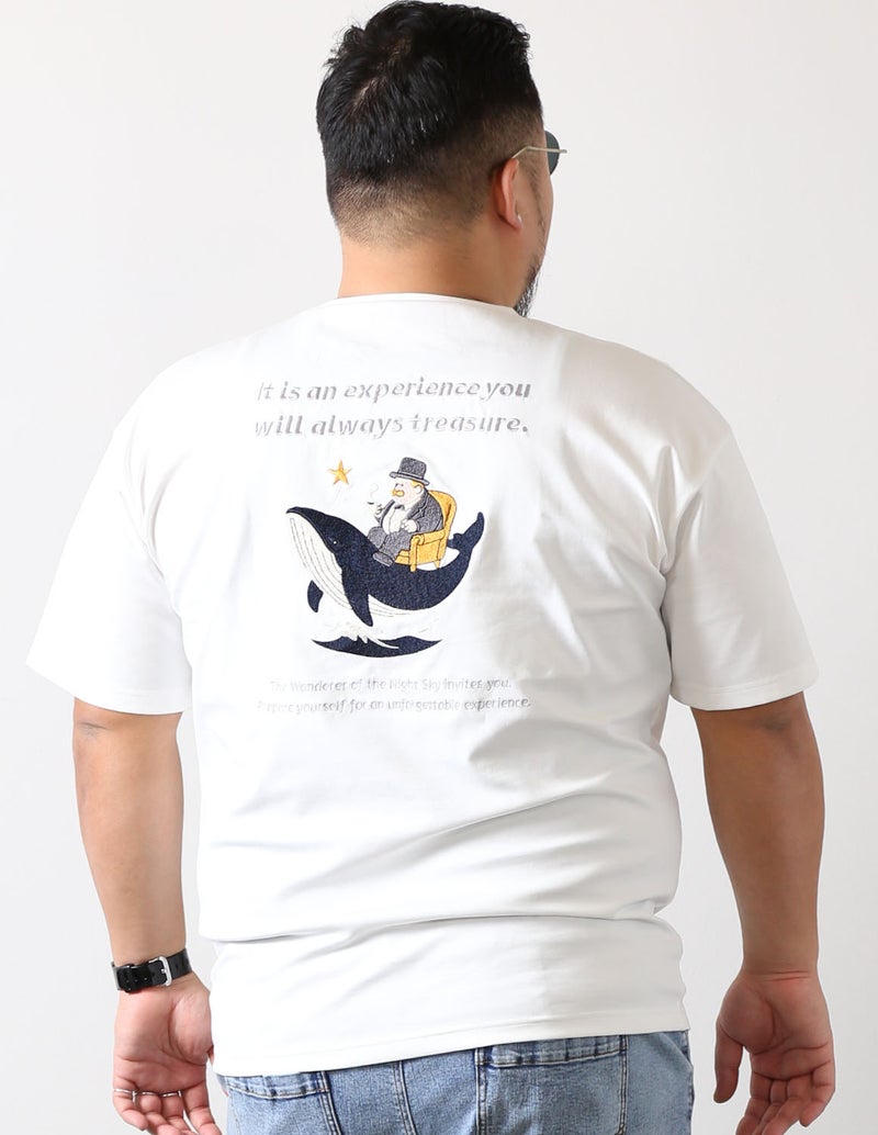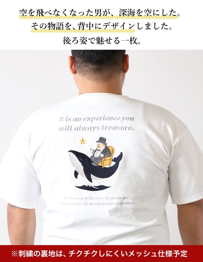 背面に夜空を駆ける鯨に座る紳士を描いた刺繍、右サイドにはピスネームをさり気なく施したこだわりのデザイン。