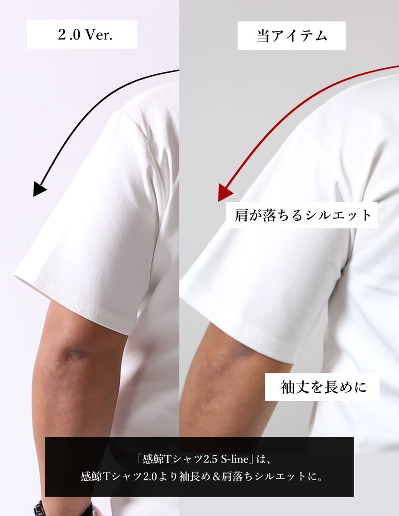 感鯨Tシャツ2.5 S-line 鼓動は、大ヒットTシャツ【感鯨Tシャツ2.0】と同じ程よく肉厚があり、高級感のある柔かく滑らかな肌触りの生地を使用し、肩幅・袖丈・首周りを改良しました。