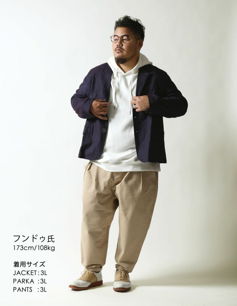 今までの大きいサイズのジャケットは袖丈、着丈が長くダボっとしていましたが、袖丈着丈を短めに設計。ウエストはXラインのくびれをメイクするデザイン。ボタンを閉じても開けていてもスマートな印象に。