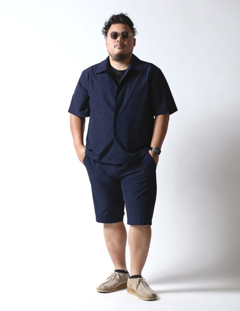 夏でもサラッと着られる薄手で伸縮性が抜群の生地をシャツジャケットとハーフパンツ両方に使用。