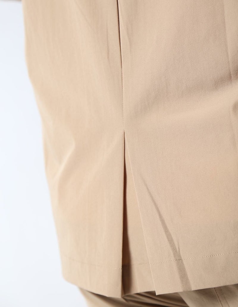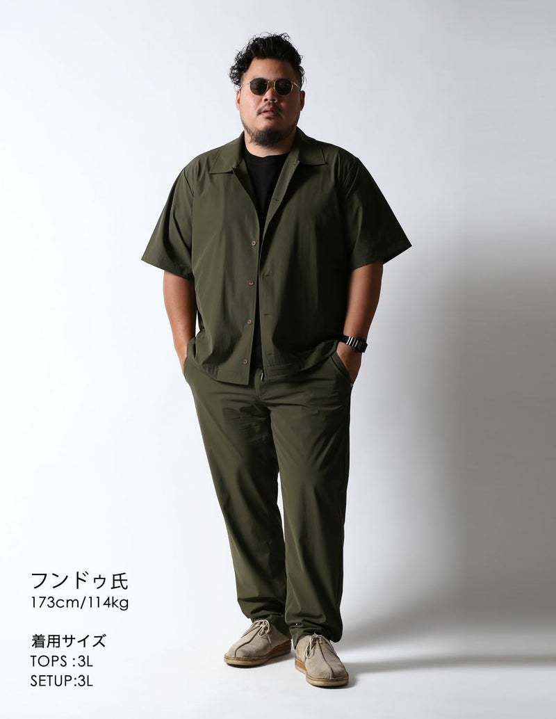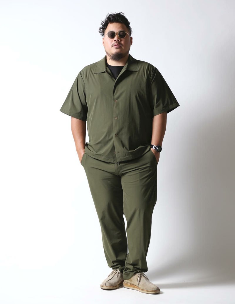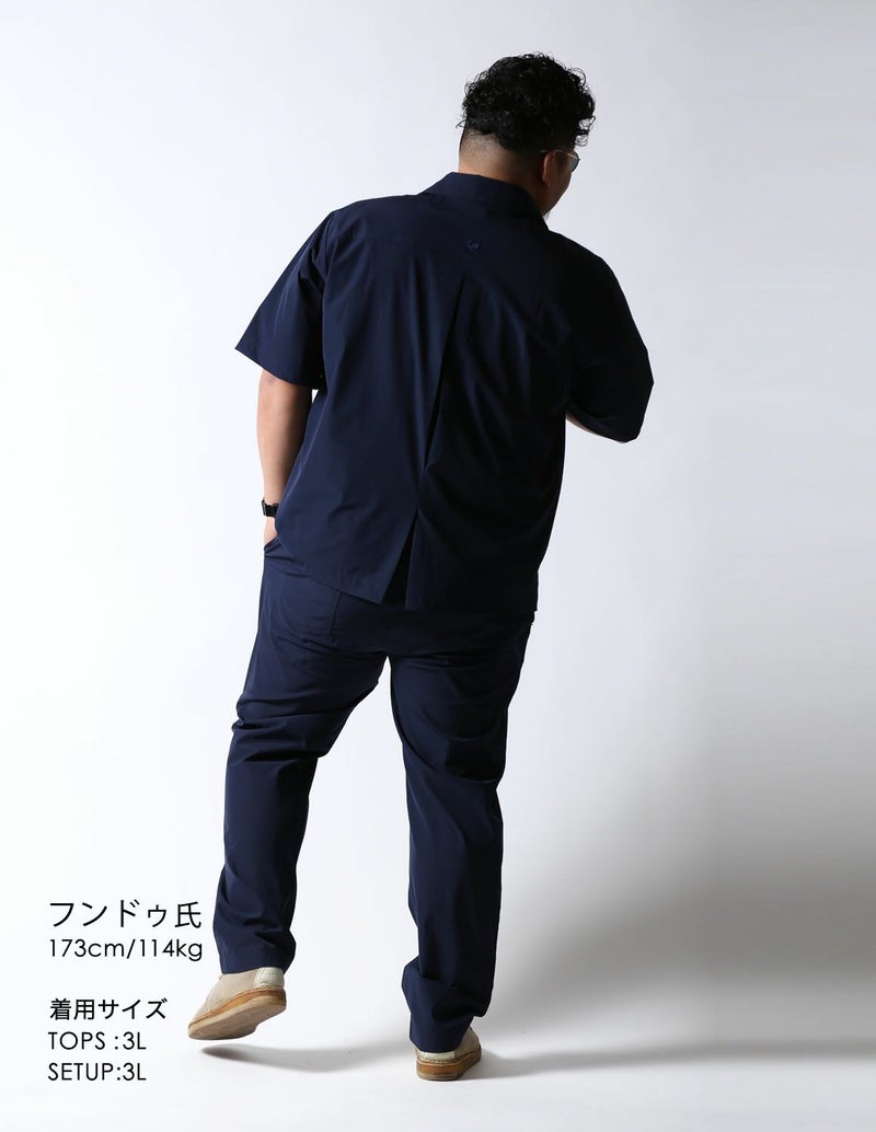 夏でもサラッと着られる薄手で伸縮性が抜群の生地をシャツジャケットとパンツ両方に使用。