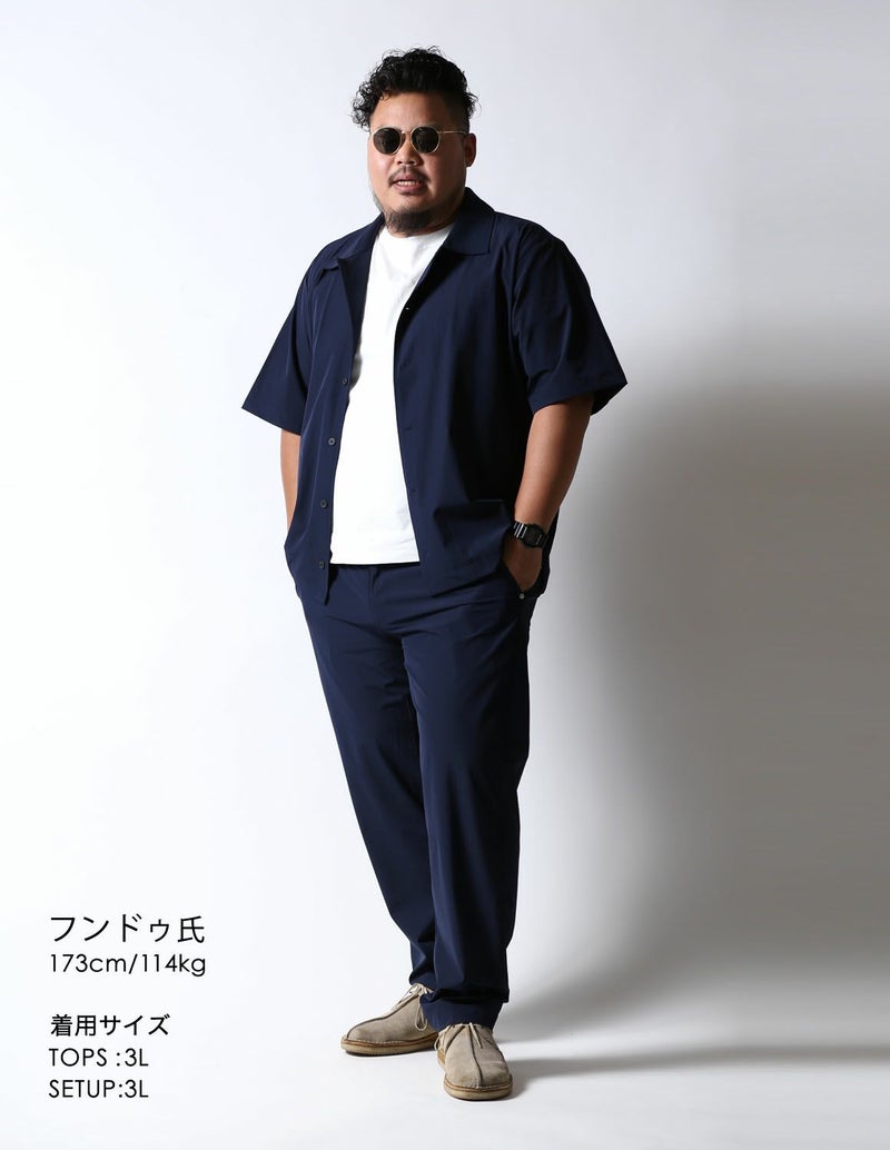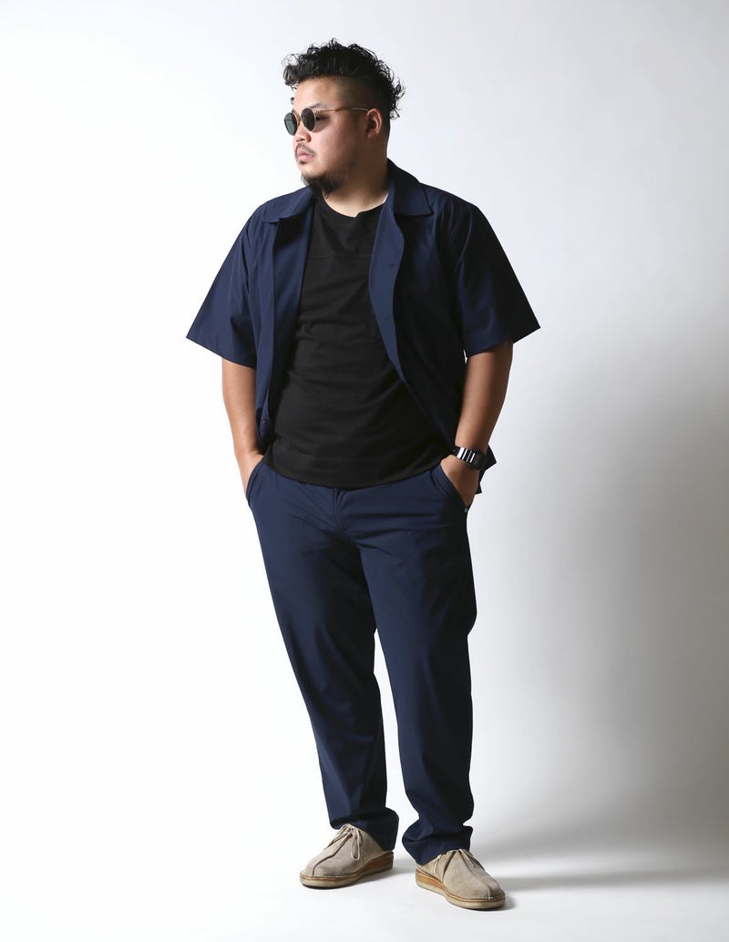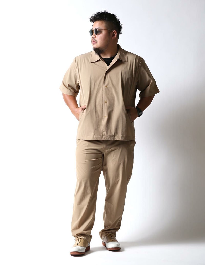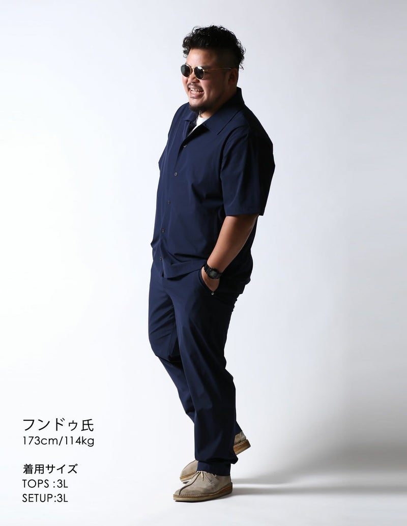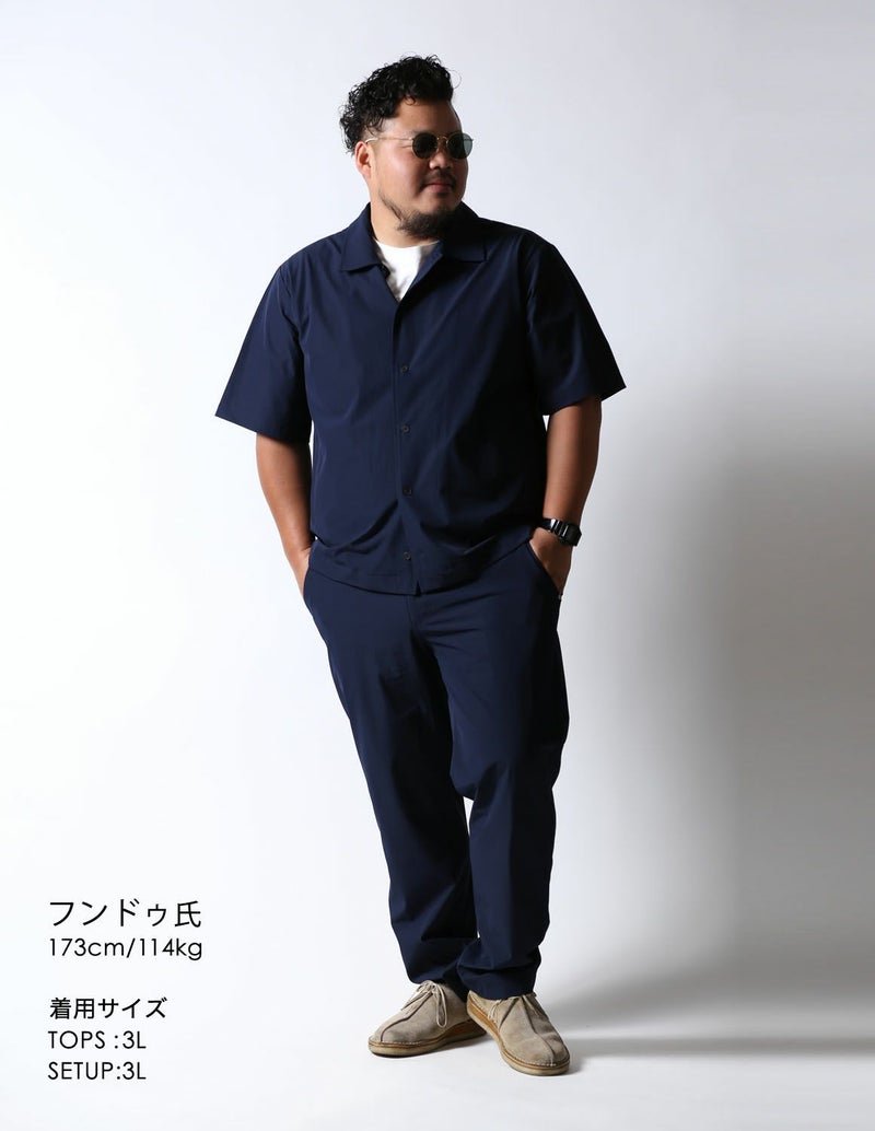 夏でもサラッと着られる薄手で伸縮性が抜群の生地をシャツジャケットとパンツ両方に使用。