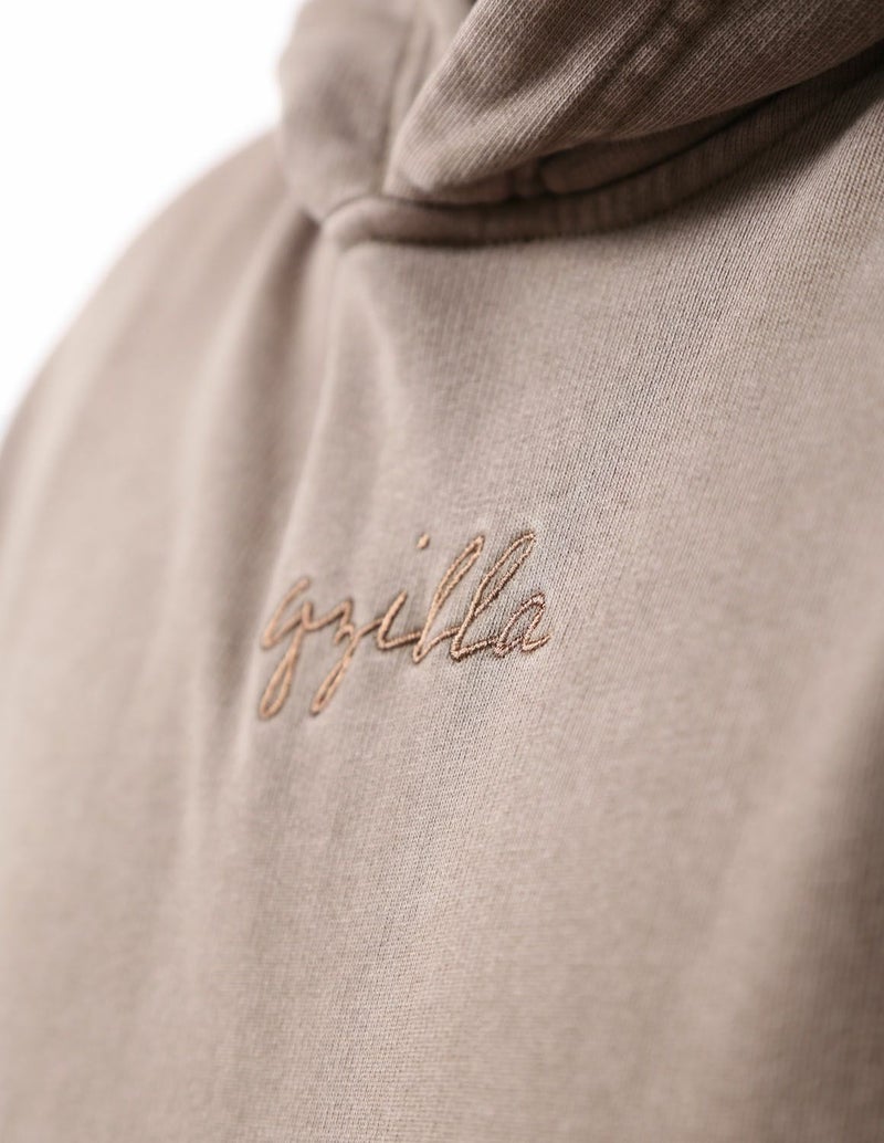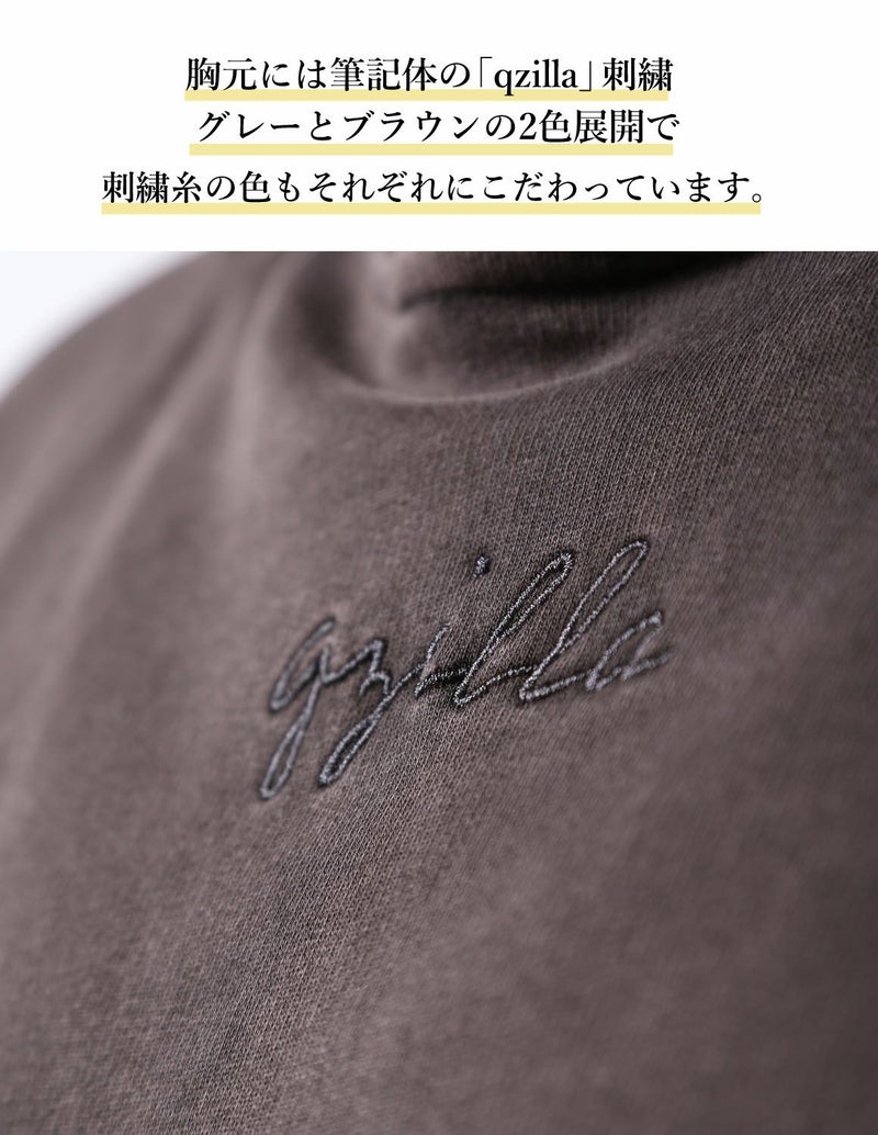 パーカーには胸元の筆記体の「qzilla」刺繍とピスネームを施した大人の為のシンプルなデザイン。ワイドパンツは裾口にドロストがあり、絞れるのでストンと落ちるような直線的なシルエットとふんわりとしたシルエットどちらも楽しめます。ワイドシルエットで重心が下半身になることでコーデに安定感が生まれます。