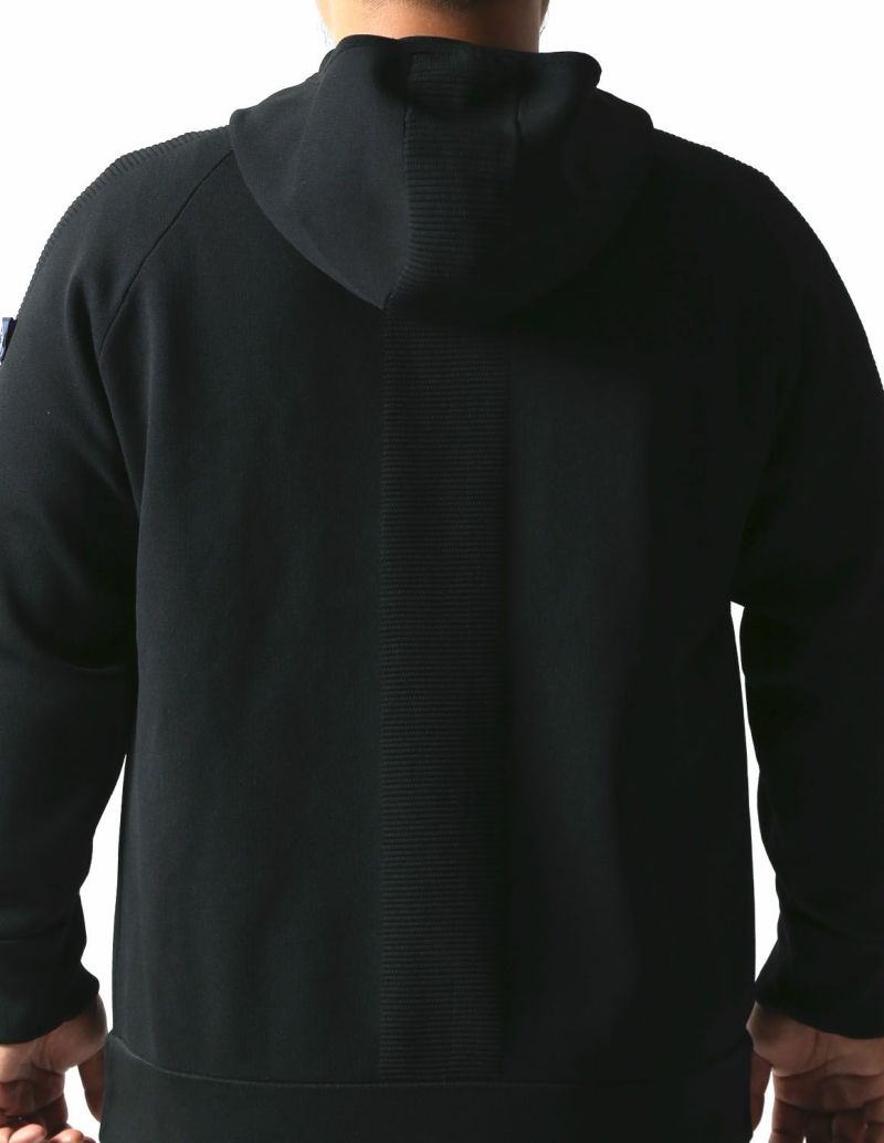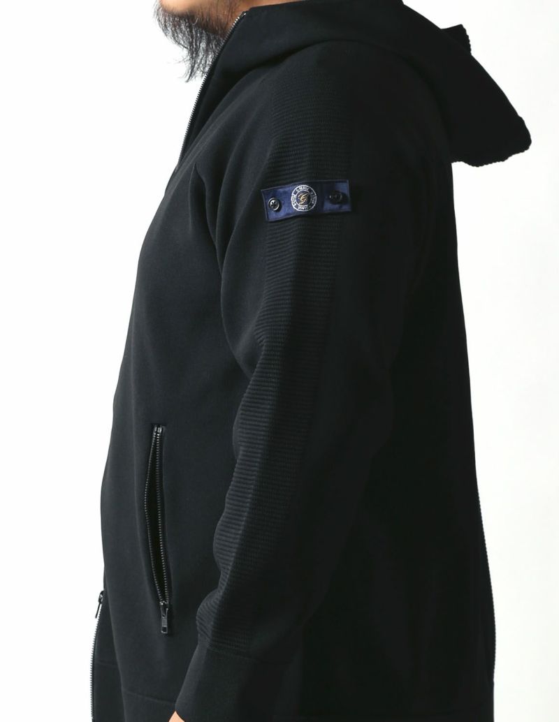 袖や背面、フードの一部をタックボーダーで切り替え、上品な編み柄のコントラストを表現し、単調になりがちなニットコーデに洒落感をプラス。