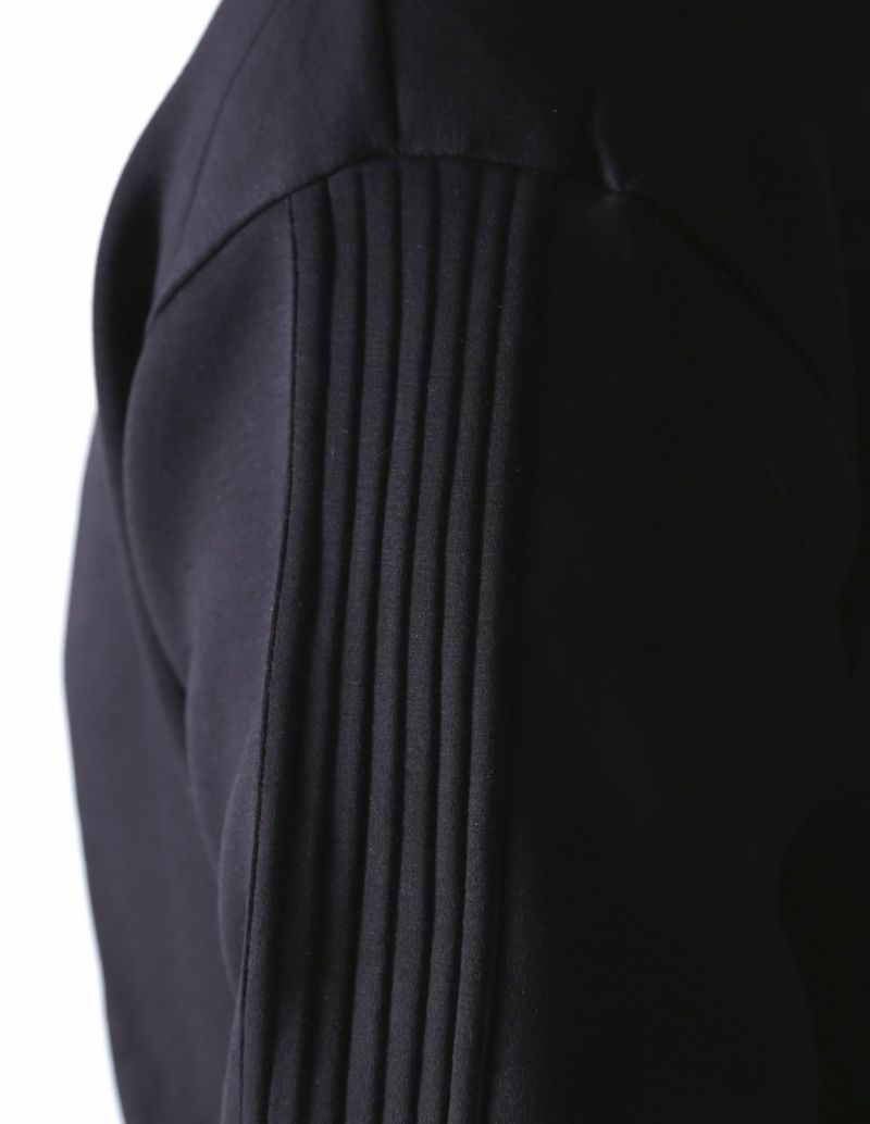 適度な厚みとハリ感のあるボンディング生地を採用し、防寒性と快適な着心地を両立。パーカーはややオーバーサイズで体型をカバーしつつ、美しいシルエットを演出します。